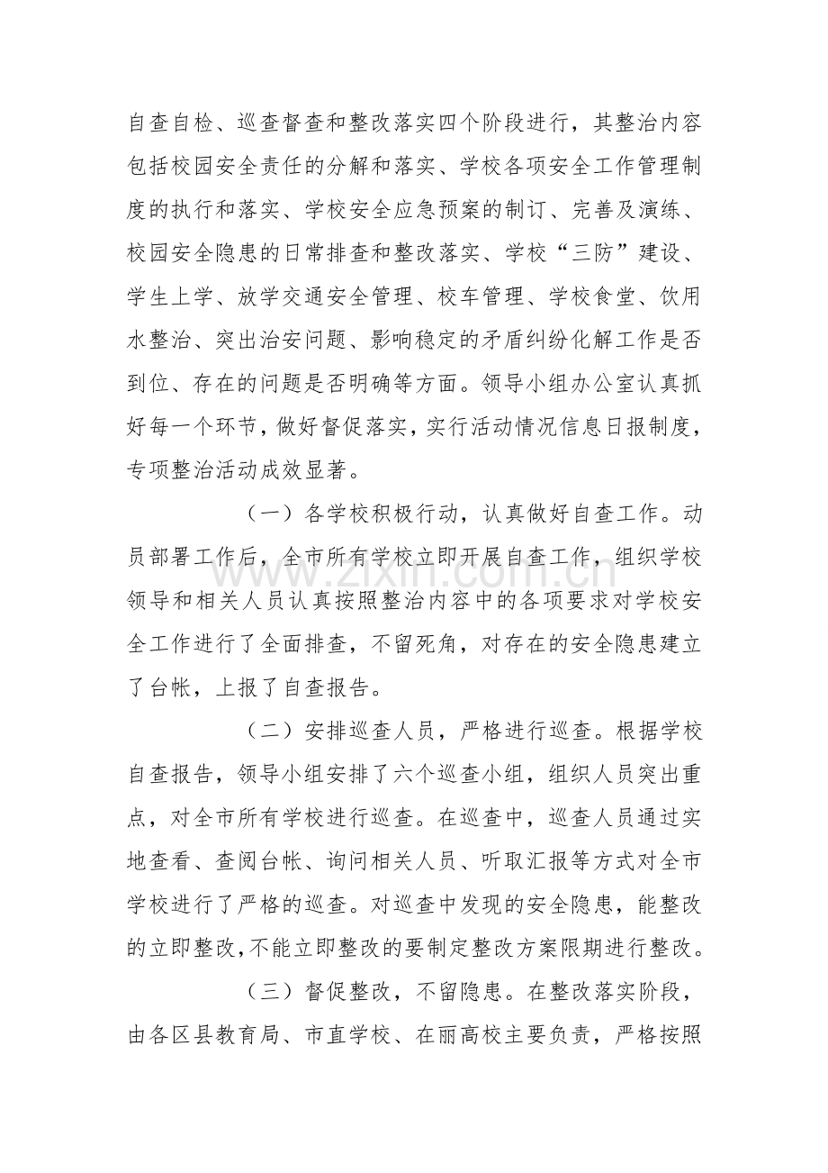 (一)各学校积极行动,认真做好自查工作。动员部署工作后,全市所有学校立即开展自查工作,组织学校领导和相关人员认真按照整治内容中的各项要求对学校安全工作进行了全面排查,不留死角,对存在的安全隐患建立了台帐,上报了自查报告。