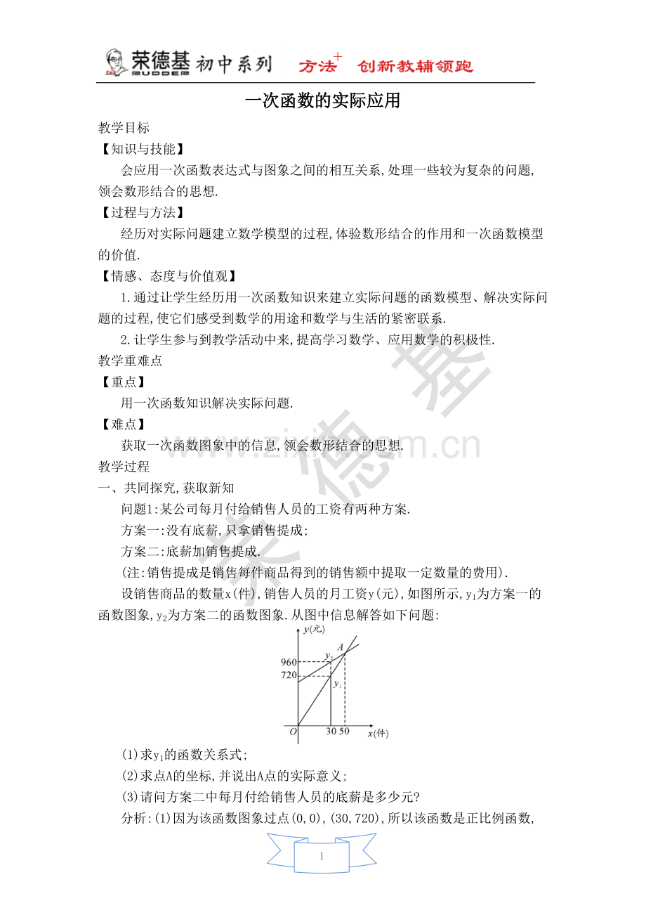 1.通过让学生经历用一次函数知识来建立实际问题的函数模型、解决实际问题的过程,使它们感受到数学的用途和数学与生活的紧密联系.