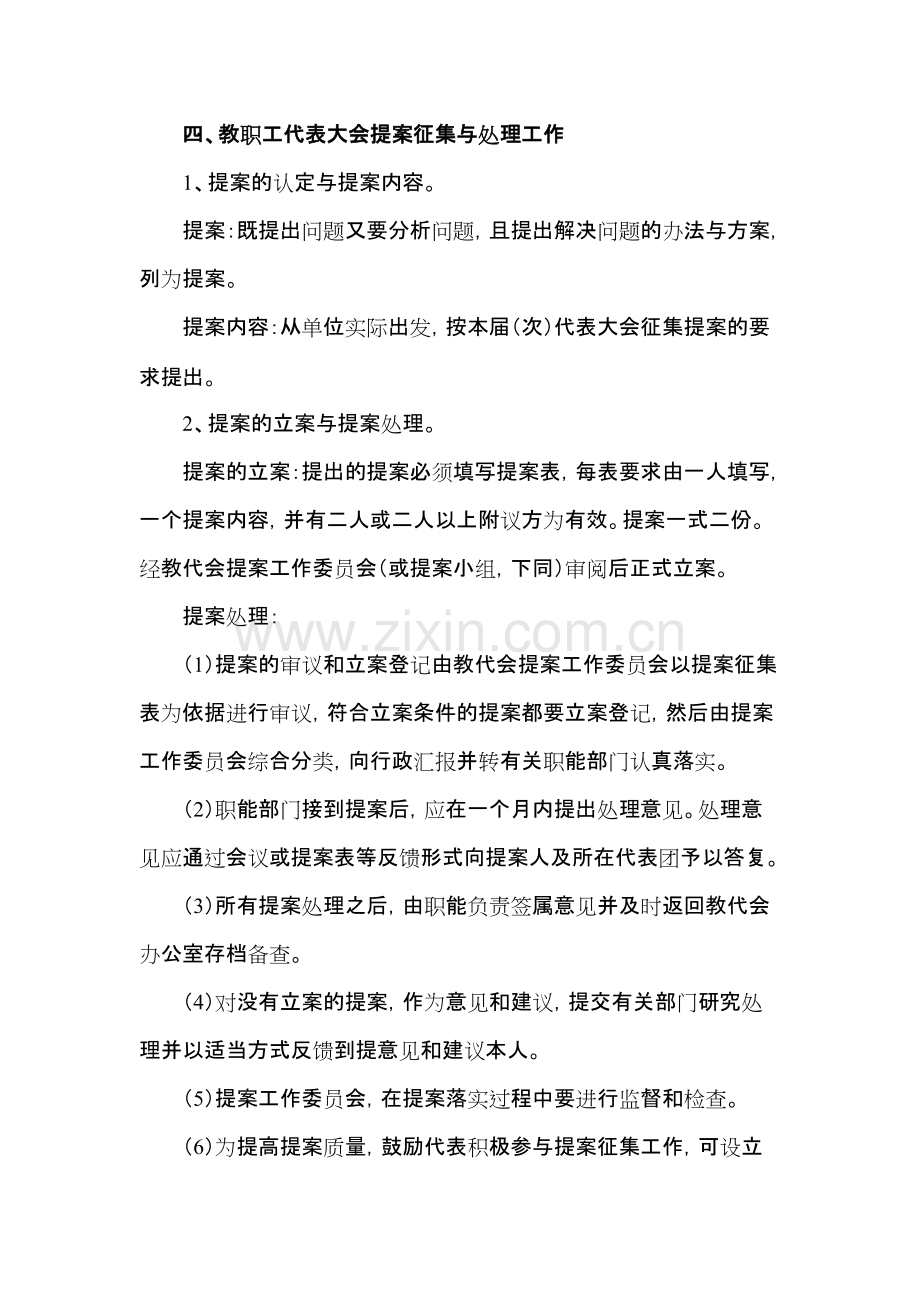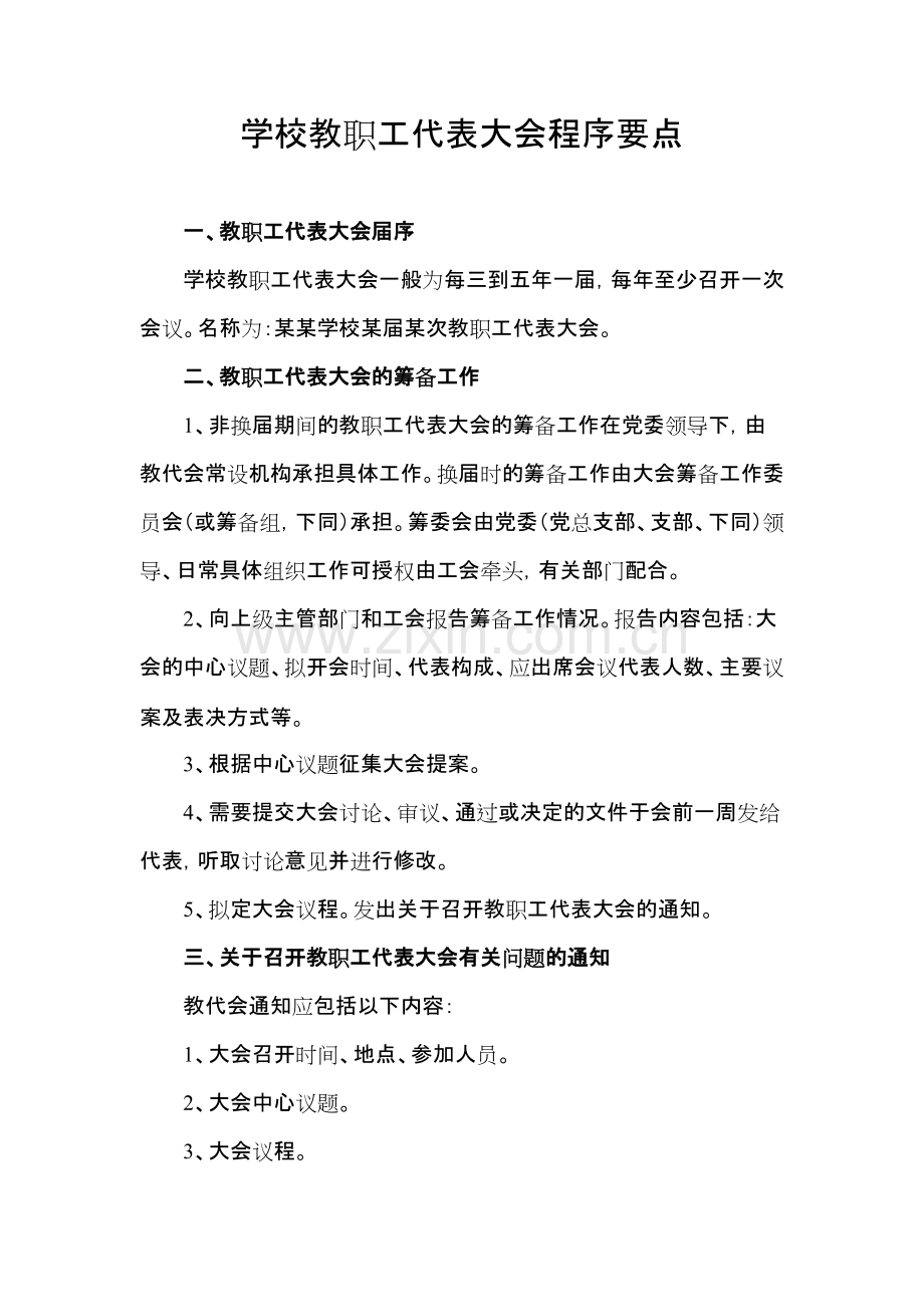 学校教职工代表大会程序要点一、教一、教职职工代表大会届序工代表大会届序学校教职工代表大会一般为每三到五年一届,每年至少召开一次会议。名称为:某某学校某届某次教职工代表大会。二、教二、教职职工代表大会的筹工代表大会的筹备备工作工作1、非换届期间的教职工代表大会的筹备工作在党委领导下,由教代会常设机构承担具体工作。换届时的筹备工作由大会筹备工作委员会(或筹备组,下同)承担。筹委会由党委(党总支部、支部、下同)领导、日常具体组织工作可授权由工会牵头,有关部门配合。2、向上级主管部门和工会报告筹备工作情况。报告内容包括:大会的中心议题、拟开会时间、代表构成、应出席会议代表人数、主要议案及表决方式等。3、根据中心议题征集大会提案。4、需要提交大会讨论、审议、通过或决定的文件于会前一周发给代表,听取讨论意见并进行修改。5、拟定大会议程。发出关于召开教职工代表大会的通知。三、关于召开教三、关于召开教职职工代表大会有关工代表大会有关问题问题的通知的通知教代会通知应包括以下内容:1、大会召开时间、地点、参加人员。2、大会中心议题。3、大会议程。四、教四、教职职工代表大会提案征集与工代表大会提案征集与处处理工作理工作1、提案的认定与提案内容。提案:既提出问题又要分析问题,且提出解决问题的办法与方案,列为提案。提案内容:从单位实际出发,按本届(次)代表大会征集提案的要求提出。2、提案的立案与提案处理。提案的立案:提出的提案必须填写提案表,每表要求由一人填写,一个提案内容,并有二人或二人以上附议方为有效。提案一式二份。经教代会提案工作委员会(或提案小组,下同)审阅后正式立案。提案处理:(1)提案的审议和立案登记由教代会提案工作委员会以提案征集表为依据进行审议,符合立案条件的提案都要立案登记,然后由提案工作委员会综合分类,向行政汇报并转有关职能部门认真落实。(2)职能部门接到提案后,应在一个月内提出处理意见。处理意见应通过会议或提案表等反馈形式向提案人及所在代表团予以答复。(3)所有提案处理之后,由职能负责签属意见并及时返回教代会办公室存档备查。(4)对没有立案的提案,作为意见和建议,提交有关部门研究处理并以适当方式反馈到提意见和建议本人。(5)提案工作委员会,在提案落实过程中要进行监督和检查。(6)为提高提案质量,鼓励代表积极参与提案征集工作,可设立优秀提案奖励制度。五、教五、教职职工代表大会特邀代表、列席代表的确定工代表大会特邀代表、列席代表的确定特邀代表:一般是离退休的校级领导、优秀教师、民主党派负责人等。列席代表:一般是未被选为正式代表的院、系、部、处党政主要领导。六、教六、教职职工代表大会主席工代表大会主席团团1、大会主席团的产生(1)非换届期间的教代会由大会主席团主持各次会议。教代会换届时由教代会选举产生大会主席团。(2)换届时的大会主席团选举建议名单由筹委会提出,经党委讨论后确定。(3)主席团成员由当选为教代会正式代表的各方面人员按规定的比例构成,包括校党政主要领导、教代会工作机构的主要负责人、各代表团(组)长、一线教师等到有关人组成。(4)根据需要,大会主席团可设秘书长,秘书长一般由工会负责人担任。(5)主席团组成人员名单提交教代会预备会议通过。2、大会主席团职责大会主席团按照民主集中制原则,实行集体领导。各次会议按分工实行执行主席负责制。具体职责是:(1)主持会议。(2)听取和综合各代表团对各项议案的审议意见。对议案进行修改。(3)草拟大会决议和决定。(4)处理大会期间重要事项。七、教七、教职职工代表大会工代表大会预备预备会会议议议议程程教职工代表大会预备会议,全体正式代表参加,由工会主持。1、工会作教职工代表大会筹备工作报告。2、通过替补代表(在教代会换届时通过教职工代表资格审查报告)的决议草案。3、召开大会主席团会议(在换届时先选举产生大会主席团)。(1)明确任务及职责。(2)做好分工4、大会审议通过正式会议议程和议题。八、教八、教职职工代表大会正式会工代表大会正式会议议议议程程(一)宣布大会前的工作。1、大会执行主席核实出席大会的教职工正式代表数。出席会议正式代表超过正式代表总数三分之二,方可开会。2、介绍参加会议的特邀代表、列席代表。3、宣布大会议程。(二)宣布开会:1、致开幕词。2、校长工作报告。3、教代会工作报告。4、行政财务工作报告。5、对提交大会审议的决议、决定进行表决。宣布选举结果。6、根据需要安排教职工代表发言。7、进行大会总结或致闭幕词。九、教九、教职职工代表大会决工代表大会决议议、决定、决定按规定对提请大会表决或确认的事项,经教代会讨论、审议后由教代会作出决议或决定。1、决议、决定的内容一般包括:决议(决定)时间;决议(决定)事项;大会对决议(决定)意见及代表对本决议(决定)的表决结果。为了保证教代会决议(决定)的准确性,应坚持一个议题一个决议(决定)的原则。2、决议、决定的形成(1)大会主席团根据对各项议题的审议情况,起草决议(决定)草案。(2)将决议(决定)草案提交各代表团讨论,征求意见。(3)大会主席团会议集中听取讨论意见汇报,