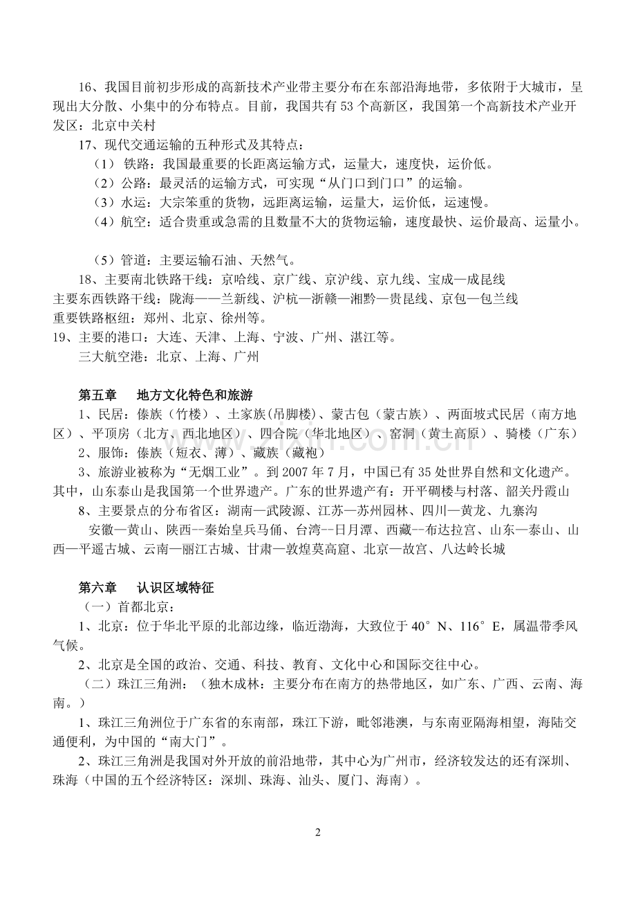 1中图版地理七年级下册复习提纲中图版地理七年级下册复习提纲 第四章第四章 自然资源与经济发展自然资源与经济发展1、自然资源:在自然界中,对人类有利用价值的土地、气候、矿产、生物、水、海洋资源等。自然资源分为可再生资源(可以在短时间内更新、再生或循环利用的)和非可再生资源(用一些少一些)两大类,可再生资源要合理利用,非可再生资源要注意节约使用。2、我国的自然资源特点:总量丰富、人均不足。世界环境日:6 月 5 日 地球日:4 月 22 日3、地球上水量的 97.5%为咸水,淡水只占 2.5%。陆地上的淡水资源,主要来自大气降水。我国的水资源总量居世界第 6 位,由于人口多,人均水量仅为世界平均水平的 1/4。4、我国的水资源时空分布不均,时间上,夏秋多、冬春少。空间上,南多北少,东多西少。华北和西北地区缺水最为严重。我国南方水多地少、北方地多水少。5、解决我国水资源紧张的状况,首先要合理利用和节约用水,防治水污染。解决水资源空间分布不均的途径是跨流域调水(南水北调工程)。解决水资源时间分布不均的途径是:修建水库。6、我国土地资源的基本特点:总量丰富、但人均占有量少。山地多,平地少,难利用土地多,后备耕地资源不足。7、中国土地资源利用类型多样,常见的有:耕地、林地、草地、沙漠、戈壁等。耕地、林地主要分布在东部季风区,草地主要分布在西部内陆地区。8、农业是国民经济的基础,工业是国民经济的主导产业。农业包括:种植业、林业、畜牧业、水产养殖业。9、在我国东南部,以秦岭淮河为界,南方以水田为主,北方以旱地为主。南方主要种植水稻、油菜、甘蔗。北方主要种植小麦、花生、大豆、甜菜、棉花。10、我国三大林区:东北林区、西南林区、南方林区(东南林区)11、我国土地利用的基本国策:珍惜和合理利用每一寸土地,切实保护耕地。12、煤炭被称为“工业的粮食”。我国的煤炭产量居世界首位,主要分布在华北、西北地区,山西、陕西、内蒙古最多。13、石油被称为“工业的血液”。我国的石油资源主要分布在东北、华北、西北地区。14、我国铁矿资源丰富,以河北、辽宁、四川三省最多。我国钢铁产量居世界第一位,已经建成九大钢铁工业中心。其中,鞍山是我国最大的钢铁工业基地。15、中国四大工业基地:(1)辽中南工业基地:我国著名的重工业基地;主要城市:沈阳、大连、鞍山(2)京津唐工业基地:我国北方最大的综合性工业基地;主要城市:北京、天津、唐山(3)沪宁杭工业基地:我国最大的综合性工业基地;主要城市:上海、南京、杭州(4)珠江三角洲工业基地:以轻工业为主的综合性工业基地。主要城市:广州、深圳、珠海216、我国目前初步形成的高新技术产业带主要分布在东部沿海地带,多依附于大城市,呈现出大分散、小集中的分布特点。目前,我国共有 53 个高新区,我国第一个高新技术产业开发区:北京中关村17、现代交通运输的五种形式及其特点:(1)铁路:我国最重要的长距离运输方式,运量大,速度快,运价低。(2)公路:最灵活的运输方式,可实现“从门口到门口”的运输。(3)水运:大宗笨重的货物,远距离运输,运量大,运价低,运速慢。(4)航空:适合贵重或急需的且数量不大的货物运输,速度最快、运价最高、运量小。(5)管道:主要运输石油、天然气。18、主要南北铁路干线:京哈线、京广线、京沪线、京九线、宝成成昆线主要东西铁路干线:陇海兰新线、沪杭浙赣湘黔贵昆线、京包包兰线重要铁路枢纽:郑州、北京、徐州等。19、主要的港口:大连、天津、上海、宁波、广州、湛江等。三大航空港:北京、上海、广州第五章第五章 地方文化特色和旅游地方文化特色和旅游1、民居:傣族(竹楼)、土家族(吊脚楼)、蒙古包(蒙古族)、两面坡式民居(南方地区)、平顶房(北方、西北地区)、四合院(华北地区)、窑洞(黄土高原)、骑楼(广东)2、服饰:傣族(短衣、薄)、藏族(藏袍)3、旅游业被称为“无烟工业”。到 2007 年 7 月,中国已有 35 处世界自然和文化遗产。其中,山东泰山是我国第一个世界遗产。广东的世界遗产有:开平碉楼与村落、韶关丹霞山8、主要景点的分布省区:湖南武陵源、江苏苏州园林、四川黄龙、九寨沟 安徽黄山、陕西-秦始皇兵马俑、台湾-日月潭、西藏-布达拉宫、山东泰山、山西平遥古城、云南丽江古城、甘肃敦煌莫高窟、北京故宫、八达岭长城第六章第六章 认识区域特征认识区域特征(一)首都北京:1、北京:位于华北平原的北部边缘,临近渤海,大致位于 40N、116E,属温带季风气候。2、北京是全国的政治、交通、科技、教育、文化中心和国际交往中心。(二)珠江三角洲:(独木成林:主要分布在南方的热带地区,如广东、广西、云南、海南。)1、珠江三角洲位于广东省的东南部,珠江下游,毗邻港澳,与东南亚隔海相望,海陆交通便利,为中国的“南大门”。2、珠江三角洲是我国对外开放的前沿地带,其中心为广州市,经济较发达的还有深圳、珠海(中国的五个经济特区:深圳、珠海、汕头、厦门、海南)。33、珠江三角洲的经济发展的有利因素包括区位因素(临海,靠近港澳)、人文因素(多侨乡)和政策因素(改革开放)等。4、珠江三角洲的经济以外向型经济为主,轻工业发达,是全球最大的电子和日用消费品生产出口基地。5、珠江三角洲的特色农业:基塘农业(三)新疆维吾尔自治区:1、位于