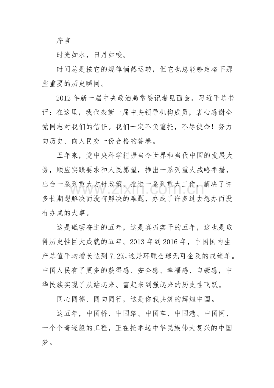 这是砥砺奋进的五年,这是真抓实干的五年,这也是取得历史性巨大成就的五年。2013年到2016年,中国国内生产总值平均增长达到7.2%,这是环顾全球无可企及的成绩单。中国人民有了更多的获得感、安全感、幸福感、自豪感,中华民族实现了从站起来、富起来到强起来的历史性飞跃。