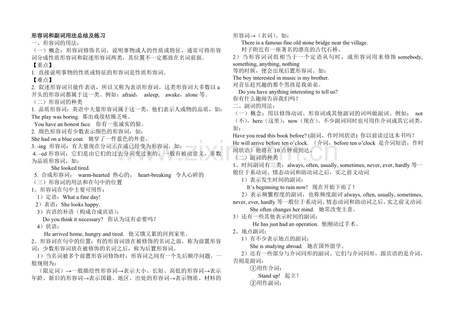 (一)概念:形容词修饰名词,说明事物或人的性质或特征,通常可将形容词分成性质形容词和叙述形容词两类,其位置不一定都放在名词前面。