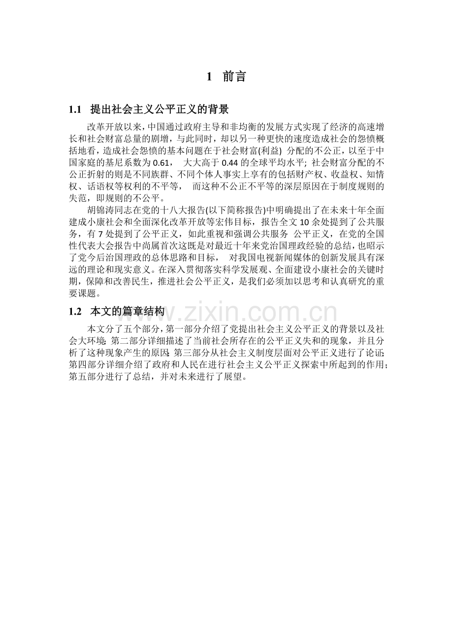 本文分了五个部分,第一部分介绍了党提出社会主义公平正义的背景以及社会大环境;第二部分详细描述了当前社会所存在的公平正义失和的现象,并且分析了这种现象产生的原因;第三部分从社会主义制度层面对公平正义进行了论证;第四部分详细介绍了政府和人民在进行社会主义公平正义探索中所起到的作用;第五部分进行了总结,并对未来进行了展望。