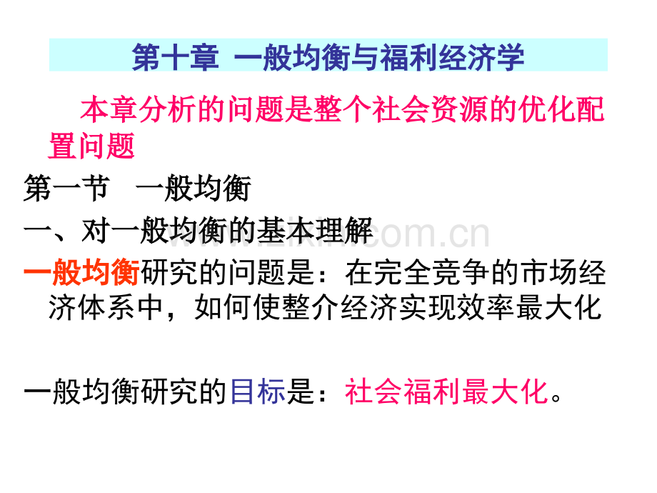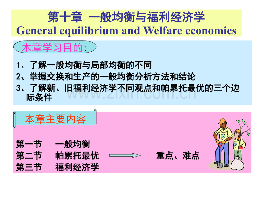 第十章第十章 一般均衡与福利经济学一般均衡与福利经济学General equilibrium and Welfare economics1、了解一般均衡与局部均衡的不同了解一般均衡与局部均衡的不同2 2、掌握交换和生产的一般均衡分析方法和结论、掌握交换和生产的一般均衡分析方法和结论3 3、了解新、旧、了解新、旧福利经济学不同观点和福利经济学不同观点和帕累托最优的三个边帕累托最优的三个边 际条件际条件第一节第一节 一般均衡一般均衡第二节第二节 帕累托最优帕累托最优 重点、难点重点、难点第三节第三节 福利经济学福利经济学本章主要内容本章学习目的:第十章第十章 一般均衡与福利经济学一般均衡与福利经济学 本章分析的问题是整个社会资源的优化配本章分析的问题是整个社会资源的优化配置问题置问题第一节第一节 一般均衡一般均衡一、对一般均衡的基本理解一、对一般均衡的基本理解一般均衡一般均衡研究的问题是:在完全竞争的市场经济体系中,如何使整介经济实现效率最大化一般均衡研究的目标是:社会福利最大化。二、一般均衡二、一般均衡一般均衡分析:一般均衡分析:研究一个变量变动所引起的一系列的研究一个变量变动所引起的一系列的连锁反应连锁反应如:产品市场的产品需求和供给不仅取决产品的自身价格而且取决于相关产品的价格和其他相关因素。一般均衡分析和局部均衡分析所得出的结论往往不同一般均衡分析和局部均衡分析所得出的结论往往不同如:降低工资对就业的影响。局部均衡分析局部均衡分析 增加就业增加就业一般均衡分析一般均衡分析 减少就业减少就业一般均衡以产品市场为例:石油价格上升电价上涨煤气价格上涨汽车价格下降互替产品互补产品第二节 帕累托最优帕累托最优18691869年获得工程学博士学位。他从事工程学和工业管理工作,年获得工程学博士学位。他从事工程学和工业管理工作,任意大利钢铁公司的总经理任意大利钢铁公司的总经理18931893年,他到洛桑大学任教,并被任年,他到洛桑大学任教,并被任命为瓦尔拉的继承人。命为瓦尔拉的继承人。18971897年,帕累托在研究资源配置时,提出了一个最优状态标准,年,帕累托在研究资源配置时,提出了一个最优状态标准,人们简称为人们简称为“帕累托最优(效率)帕累托最优(效率)”。主要内容包括:在某种既定的资源配置状态下,任何改变都不可能主要内容包括:在某种既定的资源配置状态下,任何改变都不可能使至少一个人的状况变好,而又不使任何人的状况变坏。否则,就使至少一个人的状况变好,而又不使任何人的状况变坏。否则,就不是帕累托最优,而是帕累托改进。不是帕累托最优,而是帕累托改进。年出版了年出版了政治经济学教程政治经济学教程。维尔弗里多帕累托(维尔弗里多帕累托(V.Pareto,1848-1923),意意大利经济学家,大利经济学家,新福利经济学的代表人物。一、帕累托最优帕累托最优帕累托最优的市场条件是:帕累托最优的市场条件是:完全竞争市场完全竞争市场帕累托最优:帕累托最优:如果资源配置达到了一种不损如果资源配置达到了一种不损人就不能利己的状态,那就是帕累托最优。人就不能利己的状态,那就是帕累托最优。帕累托改进:帕累托改进:在不损人的前提下,又增加了在不损人的前提下,又增加了个人利益,使效率或福利增加,那就是个人利益,使效率或福利增加,那就是帕累帕累托改进托改进.本章从交换、生产以及交换与生产相结合三本章从交换、生产以及交换与生产相结合三个方面的均衡来理解帕累托最优的含义。个方面的均衡来理解帕累托最优的含义。X二、交换的一般均衡分析1、分析的目的:通过商品交换使交换双方得到最大效用2、分析方法:艾奇沃斯(英经济学家)盒形图。3、假设:在完全竞争的市场上只有两个消费者A和B,他们都拥有两种商品X 和Y ,且有:X=XA+XB=6+4;Y=YA+YB=4+6。AB二、交换的一般均衡分析4、说明说明:消费者A和B对商品X和Y的偏好不同,只有通过交换才能使A、B双方的效用达到最大。5、分析过程:(1)分别画出消费者A和B的无差异曲线OAYUA1XUA2UA3UB1UB2UB3OBXYUB4UA4OBUB1UB2UB3XYUB4OAYUA1XUA2UA3UA4(2)将将B的无差异曲线图转的无差异曲线图转180度度与与A的无差异曲线图合成艾奇沃斯盒形图的无差异曲线图合成艾奇沃斯盒形图选盒内任意一点作十选盒内任意一点作十字线,说明字线,说明X和和Y的的最初分配状态,最初分配状态,XBXAYAYB一是商品组合一是商品组合;二是效用组合二是效用组合.交换的艾奇沃斯盒形图艾奇沃斯盒形图YXXYOAOBE1UA1E2E3UA2UA3UB3UB2UB1CXB1XA1YB1YA1DXB2YA2XA2YB2XBEXAEYAEYBE交换契约线非均衡点非均衡点均衡点均衡点选盒内任意一点作十字选盒内任意一点作十字线,说明线,说明X和和Y的最初的最初分配状态,分配状态,帕累托最优帕累托最优(3)盒内任意一点盒内任意一点C的含义:是的含义:是X和和Y的最初分配状态,的最初分配状态,(4)C点是非均衡点,在点是非均衡点,在C点点,社会总效用等于社会总效用等于UA2+UB1,在在C点点,对对A来说,来说,X少,少,MUX大大;Y多,多,MUY小小,A愿意用愿意用Y换取换取X,B反之。反之。A希望沿着希望沿着UB2以以Y换取换取X,到,到E3 点点,使效用从使效用从UA2提高到提高到 UA3。B则希望沿着则希望沿着UA2以以X换取换取Y,到,到E2点。使效用从点。使效用从UB1提高到提高到 UB2,在在E3点处,社会总效用等于