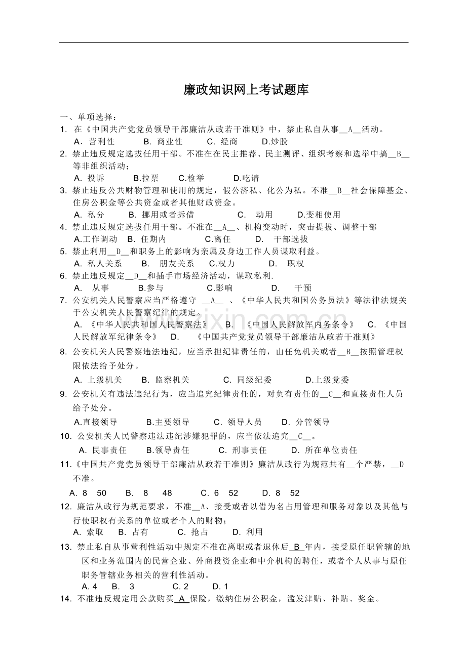 廉政知识网上考试题库
