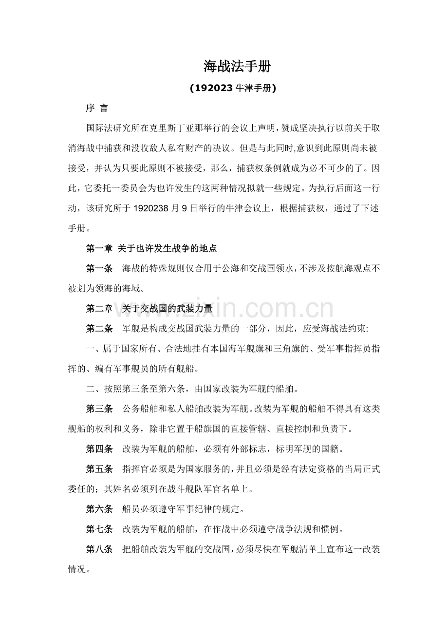 国际法研究所在克里斯丁亚那举行的会议上声明,赞成坚决执行以前关于取消海战中捕获和没收敌人私有财产的决议。但是与此同时,意识到此原则尚未被接受,并认为只要此原则不被接受,那么,捕获权条例就成为必不可少的了。因此,它委托一委员会为也许发生的这两种情况拟就一些规定。为执行后面这一行动,该研究所于1920238月9日举行的牛津会议上,根据捕获权,通过了下述手册。