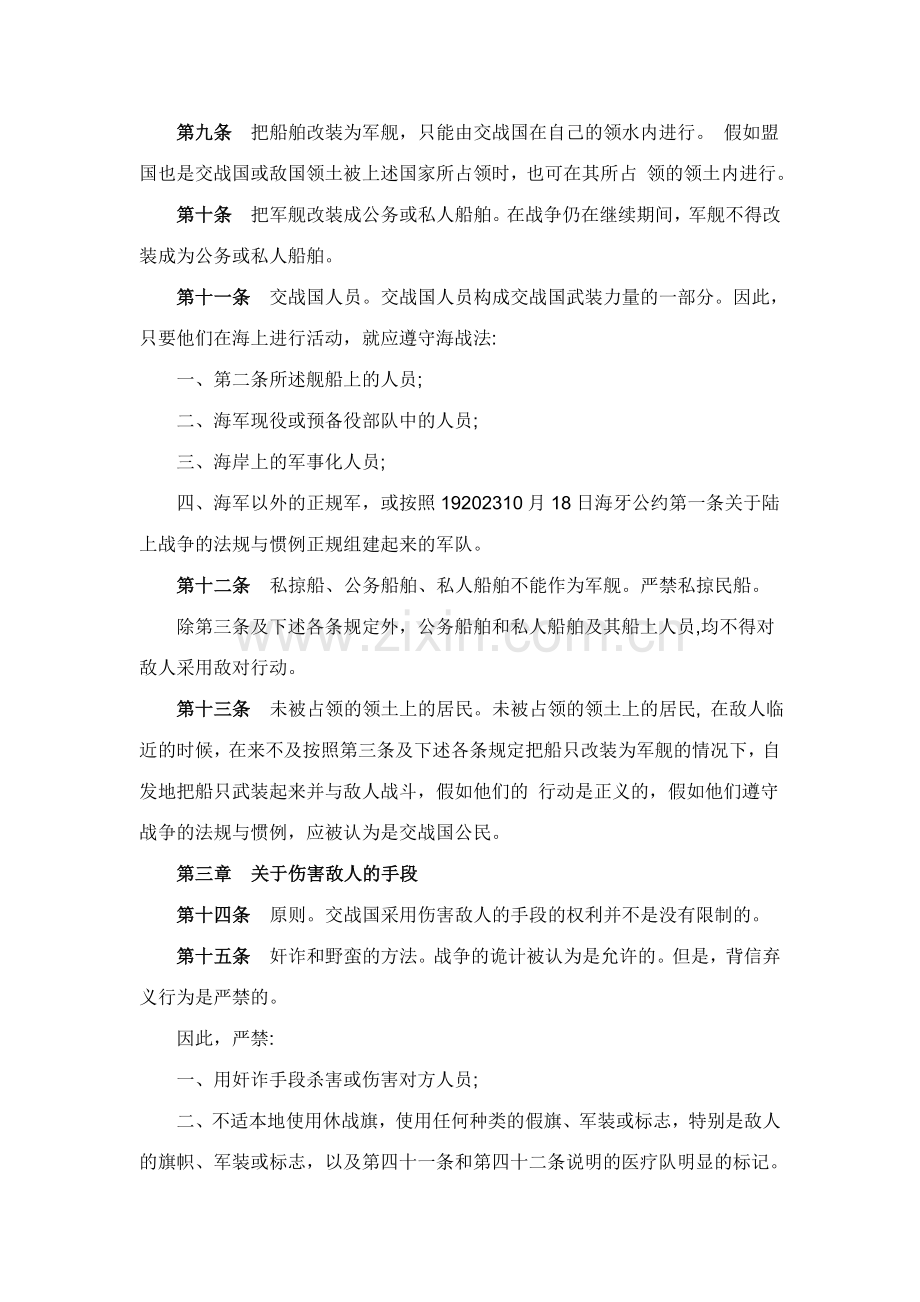 第十一条 交战国人员。交战国人员构成交战国武装力量的一部分。因此,只要他们在海上进行活动,就应遵守海战法: