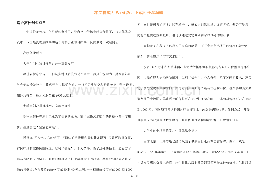 创业是条苦旅,但只要你坚持了,让自己变得越来越有价值了,那么你就是英雄。下面是我收集推举的适合高校创业项目推举,仅供参考,欢迎阅读。