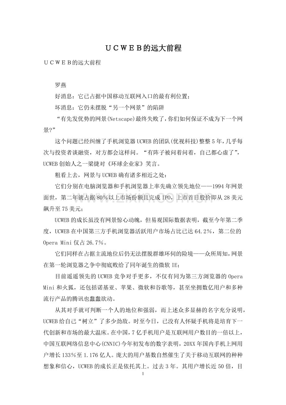 从其对手就可判断一个人的地位和强弱,而上述众多显赫的名字充分说明,UCWEB给自己“树立”了多少劲敌。时至今日,已没有人怀疑手机将是培育下一代创新和市场的最大温床。在中国,7亿手机用户是互联网用户数目的一倍以上,中国互联网络信息中心(CNNIC)今年初发布的数字表明,20XX年国内手机上网用户增长133%至1.176亿人。庞大的用户基数自然催生了关于移动互联网的种种想象和信心,UCWEB的成长正是依托其上。过去3年。其用户增长近50倍,目前已达8000多万,其中3500万是活跃用户。20XX年底,UCWEB的每月用户浏览网页总数开始赶超Opera Mini,现已接近190亿次,后者不到100亿次。最重要的是,UCWEB的上位是用户自然选择的结果,来自手机预装的增长不超过5%。