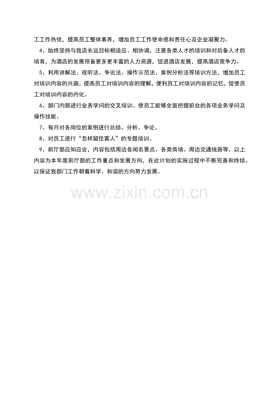 9、前厅部应知应会,内容包括周边各闻名景点、各类商场、周边交通线路等。以上内容为本年度前厅部的工作重点和发展方向,在此计划的实施过程中不断完善和终结。以保证我部门工作朝着科学、和谐的方向努力发展。