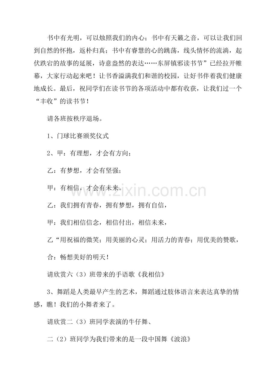 甲:下面有请学生处副主任唐月丽老师致读书节闭幕词。掌声欢迎!