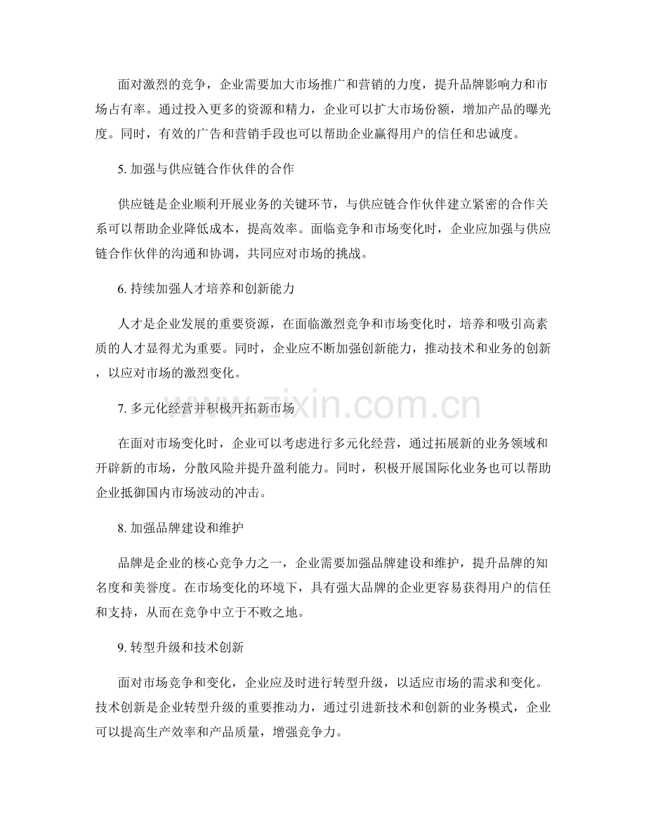 总结:面临激烈的竞争和市场变化,企业需要积极应对。通过提升产品和服务质量、加强市场推广和营销、与供应链合作伙伴的合作、加强人才培养和创新能力、多元化经营并积极开拓新市场、加强品牌建设和维护、转型升级和技术创新、与用户建立紧密的关系等多种方法,企业可以在竞争中抢占先机,适应市场的变化,实现长期发展。面对竞争和变化,企业需要保持敏锐的市场洞察力和创新能力,不断调整和完善自身的经营策略,以适应市场的需求和变化,确保企业的长远发展。