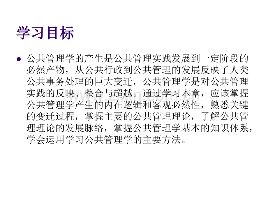 公共管理学公共管理学第一章第一章公共管理学的产生与发展公共管理学的产生与发展 学习目标学习目标l公共管理学的产生是公共管理实践发展到一定阶段的必然产物,从公共行政到公共管理的发展反映了人类公共事务处理的巨大变迁,公共管理学是对公共管理实践的反映、整合与超越。通过学习本章,应该掌握公共管理学产生的内在逻辑和客观必然性,熟悉关键的变迁过程,掌握主要的公共管理理论,了解公共管理理论的发展脉络,掌握公共管理学基本的知识体系,学会运用学习公共管理学的主要方法。本章内容本章内容公共管理学的内涵公共管理学的内涵 1公共管理学的理论渊源公共管理学的理论渊源 2公共管理学的发展、体系与学习方法公共管理学的发展、体系与学习方法 3公共管理学与中国社会变迁公共管理学与中国社会变迁 41公共利益目标与私人利益目标的分歧。公共管理必须以公共利益为目标,公共利益目标与私人利益目标的分歧。公共管理必须以公共利益为目标,私人部门管理的目标则可以定位于包括管理者在内的私人利益,这是公共私人部门管理的目标则可以定位于包括管理者在内的私人利益,这是公共管理与私人部门管理的最重要区别。管理与私人部门管理的最重要区别。垄断强制性与自由竞争性的差别。公共管理活动在本质上是国垄断强制性与自由竞争性的差别。公共管理活动在本质上是国家的活动,这使得公共管理具有明显的垄断和强制的特点(当然也家的活动,这使得公共管理具有明显的垄断和强制的特点(当然也包含非垄断和非强制性的一面),而私人部门管理则不具有这个特包含非垄断和非强制性的一面),而私人部门管理则不具有这个特点。点。制衡性与自主性的不同。与私人部门管理者在管理中具有制衡性与自主性的不同。与私人部门管理者在管理中具有较多的自主性相比,公共管理主体在实施管理的过程中,通常较多的自主性相比,公共管理主体在实施管理的过程中,通常受到较多的制衡。受到较多的制衡。4公共管理尤其是政府治理需要考虑各种利益和价值的公共管理尤其是政府治理需要考虑各种利益和价值的平衡,私人部门的管理活动主要是围绕如何实现自身的平衡,私人部门的管理活动主要是围绕如何实现自身的生存和发展展开。生存和发展展开。第一节第一节 公共管理学的内涵公共管理学的内涵1.1.1 公私部门管理的差异公私部门管理的差异5政府机制与市场机制的不同政府机制与市场机制的不同第一节第一节 公共管理学的内涵公共管理学的内涵l1.1.2公共管理和公共管理学的内涵l1公共管理的内涵l公共管理(public management)是关于以政府为核心的公共部门处理公共事务、提供公共产品和服务的活动。l一是广义的,由于有人类社会就有公共生活及其管理,因此,最广义的公共管理可以追溯到早期的人类社会;l二是比较狭义的,指发端于19世纪末、以行政管理学或公共行政学(public administration)名称出现的公共管理;l三是严格意义的公共管理,即滥觞于20世纪70年代,勃兴于80年代“新公共管理”(new public management)运动,也是本书所称的公共管理。第一节第一节 公共管理学的内涵公共管理学的内涵l1.1.2公共管理和公共管理学的内涵l2公共管理学的内涵l(1)管理。可以把管理看做在一定环境中,管理主体为了达到特定的目标而运用一定的职能和手段,对管理客体加以调节和控制的过程。l(2)公共管理。是指政府为代表的公共部门依法通过对社会公共事务的管理,以保障和增进社会公共利益的职能活动。l(3)公共管理学。公共管理学(Discipline of Public Management)是一门运用包括管理学、经济学、政治学在内的多学科的理论和方法,研究公共管理部门和公共管理过程及其规律性的科学;是关于促进以政府为核心的公共组织更有效地提供公共物品和公共服务,以增进和公平分配社会公共利益的知识体系。第一节第一节 公共管理学的内涵公共管理学的内涵l1.1.2公共管理和公共管理学的内涵l3当前阶段的公共管理学,具有如下值得注意的特点:l(1)鲜明的实践导向性。公共管理学产生的基本原因,在于传统行政学除旧有的学科局限外,越来越难以应付知识经济和全球化条件下公共领域中出现的大量新现象、新问题。公共管理学正是在坚持实践导向中,通过有效地回应这些挑战,显示自己的学科优势,并获得源源不断的学科发展动力。l(2)理论上的包容性。为解决公共管理实践提出的各种问题,公共管理学兼收并蓄,积极从其他学科吸收理论养分,这使公共管理学呈现出交叉性强的特点。可以说,公共管理学对于政治学、经济学、社会学、心理学等基础社会科学学科具有很强的依赖性。l(3)学科的年轻性。第二节第二节 公共管理学的理论渊源公共管理学的理论渊源 l1.2.1政治行政二分法l威尔逊、古德诺:将公共事务分为公共意志的表达与执行两个既联系又区别的过程,意志的表达与整合过程需要发挥民主、尊重公民权利等;意志的执行过程则应通过理性模式、提高行动效率从而在结果上保障公共意志的实现。l政治行政二分法(dichotomy of politics and administration)长期以来被视为对公共管理学的经典界定,它是公共管理学的理论基石之一。政治政治政治政治行政行政行政行政社会治理系统社会治理系统在政治领域,对问在政治领域,对问题进行