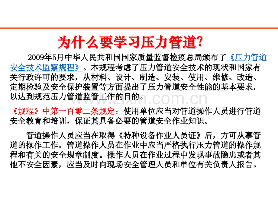 压力管道巡检讲义压力管道巡检讲义姚赖想为什么要学习压力管道?为什么要学习压力管道?20092009年年5 5月中华人民共和国国家质量监督检疫总局颁布了月中华人民共和国国家质量监督检疫总局颁布了压力管道压力管道安全技术监察规程安全技术监察规程。本规程考虑了压力管道安全技术的现状和国家有。本规程考虑了压力管道安全技术的现状和国家有关行政许可的要求,从材料、设计、制造、安装、使用、维修、改造、关行政许可的要求,从材料、设计、制造、安装、使用、维修、改造、定期检验及安全保护装置等方面提出了压力管道安全性能的基本要求,定期检验及安全保护装置等方面提出了压力管道安全性能的基本要求,以达到规范压力管道监管工作的目的。以达到规范压力管道监管工作的目的。规程规程中第一百零二条规定:中第一百零二条规定:使用单位应当对管道操作人员进行管道使用单位应当对管道操作人员进行管道安全教育和培训,保证其具备必要的管道安全作业知识。安全教育和培训,保证其具备必要的管道安全作业知识。管道操作人员应当在取得管道操作人员应当在取得特种设备作业人员证特种设备作业人员证后,方可从事管后,方可从事管道的操作工作。管道操作人员在作业中应当严格执行压力管道的操作规道的操作工作。管道操作人员在作业中应当严格执行压力管道的操作规程和有关的安全规章制度。操作人员在作业过程中发现事故隐患或者其程和有关的安全规章制度。操作人员在作业过程中发现事故隐患或者其他不安全因素,应当及时向现场安全管理人员和单位有关负责人报告。他不安全因素,应当及时向现场安全管理人员和单位有关负责人报告。1 12 23 3第三章第三章 法规知识法规知识第二章第二章 安全知识安全知识第一章第一章 基础知识基础知识 事故案例分享事故案例分享4 4问答问答1 1第一章第一章 基础知识基础知识质检总局关于修订质检总局关于修订特种设备目录特种设备目录的公告的公告(2014年第年第114号号)根据中华人民共和国特种设备安全法特种设备安全监察条例的规定,质检总局修订了特种设备目录,经国务院批准,现予以公布施行。压力管道的定义及分类压力管道的定义及分类压力管道,是指利用一定的压力,用于输送气体或者液体的管状设备,其范围规定为最高工作压力大于或者等于0.1MPa(表压),介质为气体、液化气体、蒸汽或者可燃、易爆、有毒、有腐蚀性、最高工作温度高于或者等于标准沸点的液体,且公称直径大于或者等于50mm的管道。公称直径小于150mm,且其最高工作压力小于1.6MPa(表压)的输送无毒、不可燃、无腐蚀性气体的管道和设备本体所属管道除外。其中,石油天然气管道的安全监督管理还应按照安全生产法、石油天然气管道保护法等法律法规实施。1.11.1压力管道安全操作技术与要求压力管道安全操作技术与要求压力管道安全操作技术与要求压力管道安全操作技术与要求P1 压力管道使用单位要制定操作人员安全管理压力管道使用单位要制定操作人员安全管理制度和岗位职责,选择适应岗位要求并持有制度和岗位职责,选择适应岗位要求并持有特特种设备作业人员证种设备作业人员证的人员负责岗位工作。压力的人员负责岗位工作。压力管道操作人员岗位职责应包括以下内容:管道操作人员岗位职责应包括以下内容:1、操作人员熟知岗位工作基本要求和范围:、操作人员熟知岗位工作基本要求和范围:如岗如岗位范围。可按系统、装置或管道名称等予以规定;位范围。可按系统、装置或管道名称等予以规定;管理操作或控制参数要求等。管理操作或控制参数要求等。压力管道操作人员岗位职责压力管道操作人员岗位职责2、满足岗位人员岗位工作基本条件、持证要求、满足岗位人员岗位工作基本条件、持证要求等。等。(1)年龄在)年龄在18周岁以上(含周岁以上(含18周岁),周岁),60周岁以下(含周岁以下(含60周岁);周岁);(2)身体健康,能够胜任本岗位工作;)身体健康,能够胜任本岗位工作;(3)具有相关的压力管道安全技术知识和操作技能;)具有相关的压力管道安全技术知识和操作技能;(4)工业管道)工业管道-3、-2级操作人员应当具有初中以上级操作人员应当具有初中以上(含初中)文化程度,(含初中)文化程度,工业管道工业管道-1级操作人员应当具有级操作人员应当具有高中以上(含高中)文化程度,在本岗位从事相关操作实高中以上(含高中)文化程度,在本岗位从事相关操作实习半年以上(含半年)习半年以上(含半年);(备注)(备注)(5)公用管道操作人员应当具有初中以上文化程度,在)公用管道操作人员应当具有初中以上文化程度,在本岗位从事相关操作实习本岗位从事相关操作实习1年以上;年以上;(6)长输管道操作人员应当具有高中以上文化程度,在)长输管道操作人员应当具有高中以上文化程度,在本岗位从事相关操作实习本岗位从事相关操作实习2年以上;年以上;(7)经专业培训和考核,取得相应级别的压力管道操作)经专业培训和考核,取得相应级别的压力管道操作证。证。3、严格遵守国家有关安全生产、压力管道安全管理规定,、严格遵守国家有关安全生产、压力管道安全管理规定,拒绝违规行为,拒绝违规行为,包括上级和相关人员命令或行为,并及时包括上级和相关人员命令或行为