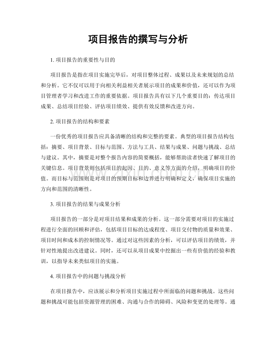 总之,项目报告的撰写和分析是项目管理工作中非常重要的一环。通过对项目过程和结果的总结和分析,可以为未来类似项目的实施提供宝贵经验和教训,促进项目管理水平的提高。同时,项目报告还可以传达项目的成果和价值,吸引相关利益相关者的关注与支持。因此,项目报告的撰写和分析应被重视,并注重其结构和内容的完整性与准确性。