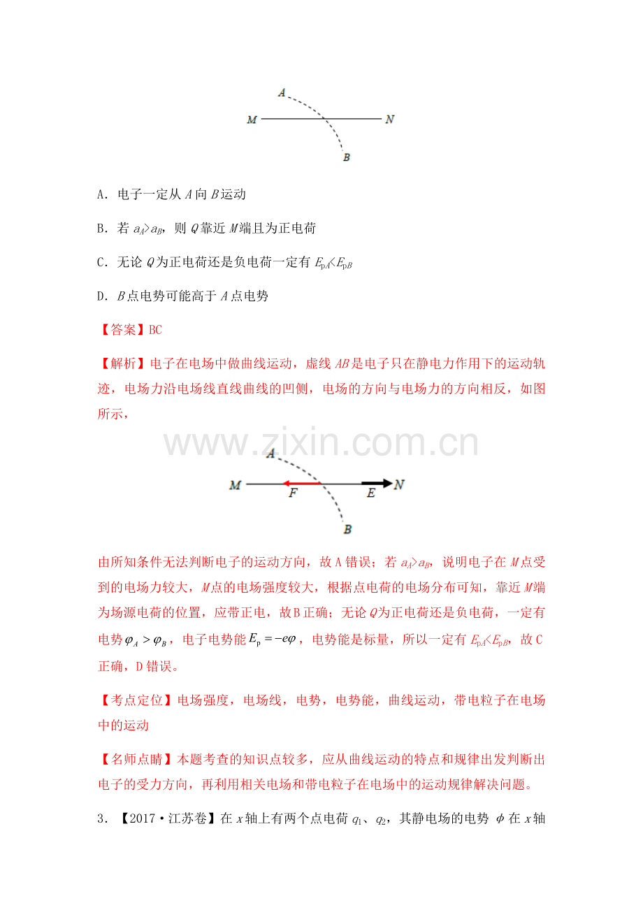 2.【2017·天津卷】如图所示,在点电荷Q产生的电场中,实线MN是一条方向未标出的电场线,虚线AB是一个电子只在静电力作用下的运动轨迹。设电子在A、B两点的加速度大小分别为aA、aB,电势能分别为EpA、EpB。下列说法正确的是
