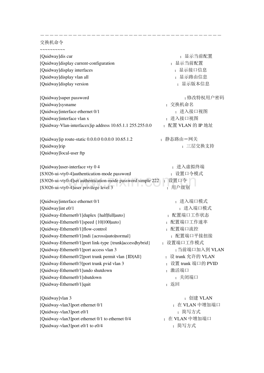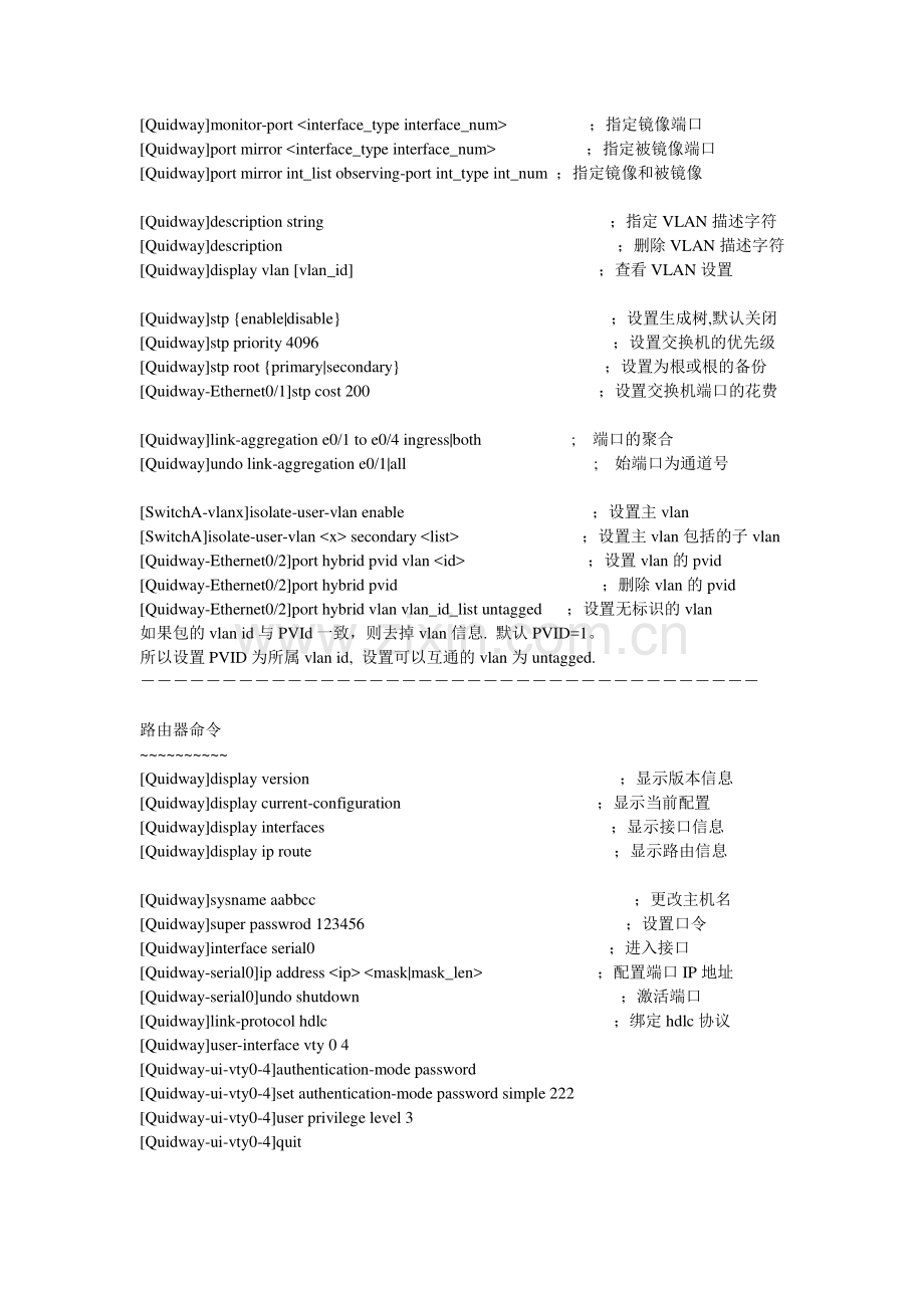 交换机命令 Quidwaydis cur ;显示当前配置 Quidwaydisplay current-configuration ;显示当前配置 Quidwaydisplay interfaces ;显示接口信息 Quidwaydisplay vlan all ;显示路由信息 Quidwaydisplay version ;显示版本信息 Quidwaysuper password ;修改特权用户密码 Quidwaysysname ;交换机命名 Quidwayinterface ethernet 0/1 ;进入接口视图 Quidwayinterface vlan x ;进入接口视图 Quidway-Vlan-interfacexip address 10.65.1.1 255.255.0.0 ;配置 VLAN 的 IP 地址 Quidwayip route-static 0.0.0.0 0.0.0.0 10.65.1.2 ;静态路由网关 Quidwayrip ;三层交换支持 Quidwaylocal-user ftp Quidwayuser-interface vty 0 4 ;进入虚拟终端 S3026-ui-vty0-4authentication-mode password ;设置口令模式 S3026-ui-vty0-4set authentication-mode password simple 222 ;设置口令 S3026-ui-vty0-4user privilege level 3 ;用户级别 Quidwayinterface ethernet 0/1 ;进入端口模式 Quidwayint e0/1 ;进入端口模式 Quidway-Ethernet0/1duplex half|full|auto ;配置端口工作状态 Quidway-Ethernet0/1speed 10|100|auto ;配置端口工作速率 Quidway-Ethernet0/1flow-control ;配置端口流控 Quidway-Ethernet0/1mdi across|auto|normal ;配置端口平接扭接 Quidway-Ethernet0/1port link-type trunk|access|hybrid ;设置端口工作模式 Quidway-Ethernet0/1port access vlan 3 ;当前端口加入到 VLAN Quidway-Ethernet0/2port trunk permit vlan ID|All ;设 trunk 允许的 VLAN Quidway-Ethernet0/3port trunk pvid vlan 3 ;设置 trunk 端口的 PVID Quidway-Ethernet0/1undo shutdown ;激活端口 Quidway-Ethernet0/1shutdown ;关闭端口 Quidway-Ethernet0/1quit ;返回 Quidwayvlan 3 ;创建 VLAN Quidway-vlan3port ethernet 0/1 ;在 VLAN 中增加端口 Quidway-vlan3port e0/1 ;简写方式 Quidway-vlan3port ethernet 0/1 to ethernet 0/4 ;在 VLAN 中增加端口 Quidway-vlan3port e0/1 to e0/4 ;简写方式 Quidwaymonitor-port ;指定镜像端口 Quidwayport mirror ;指定被镜像端口 Quidwayport mirror int_list observing-port int_type int_num;指定镜像和被镜像 Quidwaydescription string ;指定 VLAN 描述字符 Quidwaydescription ;删除 VLAN 描述字符 Quidwaydisplay vlan vlan_id ;查看 VLAN 设置 Quidwaystp enable|disable ;设置生成树,默认关闭 Quidwaystp priority 4096 ;设置交换机的优先级 Quidwaystp root primary|secondary ;设置为根或根的备份 Quidway-Ethernet0/1stp cost 200 ;设置交换机端口的花费 Quidwaylink-aggregation e0/1 to e0/4 ingress|both ;端口的聚合 Quidwayundo link-aggregation e0/1|all ;始端口为通道号 SwitchA-vlanxisolate-user-vlan enable ;设置主 vlan SwitchAisolate-user-vlan secondary ;设置主 vlan 包括的子 vlan Quidway-Ethernet0/2port hybrid pvid vlan ;设置 vlan 的 pvid Quidway-Ethernet0/2port hybrid pvid ;删除 vlan 的 pvid Quidway-Ethernet0/2port hybrid vlan vlan_id_list untagged ;设置无标识的 vlan 如果包的 vlan id 与 PVId 一致,则去掉 vlan 信息.默认 PVID=1。所以设置 PVID 为所属 vlan id,设置可以互通的 vlan 为 untagged.路由器命令 Quidwaydisplay version ;显示版本信息 Quidwaydisplay current-configuration ;显示当前配置 Quidwaydisplay interfaces ;显示接口信息 Quidwaydisplay ip route ;显示路由信息 Quidwaysysname aabbcc ;更改主机名 Quidwaysuper passwrod 123456 ;设置口令 Quidwayinterface serial0 ;进入接口 Quidway-serial0ip address ;配置端口 IP 地址 Quidway-serial0undo shutdown ;激活端口 Quidwaylink-protocol hdlc ;绑定 hdlc 协议 Quidwayuser-interface vty 0 4 Quidway-ui-vty0-4authentication-mode password Quidway-ui-vty0-4set authentication-mode password simple 222 Quidway-ui-vty0-4user privilege level 3 Quidway-ui-vty0-4quit Quidwaydebugging hdlc all serial0 ;显示所有信息 Quidwaydebugging hdlc event serial0 ;调试事件信息 Quidwaydebugging hdlc packet serial0 ;显示包的信息 静态路由:Quidwayip route-static interface number|nexthopvaluereject|blackhole 例如:Quidwayip route-static 129.1.0.0 16 10.0.0.2 Quidwayip route-static 129.1.0.0 255.255.0.0 10.0.0.2 Quidwayip route-static 129.1.0.0 16 Serial 2 Quidwayip route-static 0.0.0.0 0.0.0.0 10.0.0.2 动态路由:Quidwayrip ;设置动态路由 Quidwayrip work ;设置工作允许 Quidwayrip input ;设置入口允许 Quidwayrip output ;设置出口允许 Quidway-ripnetwork 1.0.0.0 ;设置交换路由网络 Quidway-ripnetwork all ;设置与所有网络交换 Quidway-rippeer ip-address ;Quidway-ripsummary ;路由聚合 Quidwayrip version 1 ;设置工作在版本 1 Quidwayrip version 2 multicast ;设版本 2,多播方式 Quidway-Ethernet0rip split-horizon ;水平分隔 Quidwayrouter id A.B.C.D ;配置路由器的 ID Quidwayospf enable ;启动 OSPF 协议 Quidway-ospfimport-route direct ;引入直联路由 Quidway-Serial0ospf enable area ;配置 OSPF 区域 标准访问列表命令格式如下:acl match-order config|auto ;默认前者顺序匹配。rule normal|specialpermit|deny source source-addr source-wildcard|any 例:Quidwayacl 10 Quidway-acl-10rule normal permit source 10.0.0.0 0.0.0.255 Quidway-acl-10rule normal deny source any 扩展访问控制列表配置命令 配置 TCP/UDP 协议的扩展访问列表:rule normal|specialpermit|denytcp|udpsource|anydestination|any operate 配置 ICMP 协议的扩展访问列表:rule normal|specialpermit|denyicmp source|anydestination|any icmp-code logging 扩展访问控制列表操作符的含义 equal portnumber ;等于 greater-than portnumber ;大于 less-than portnumber ;小于 not-equal portnumber ;不等 range portnumber1 portnumber2 ;区间 扩展访问控制列表举例 Quidwayacl 101 Quidway-acl-101rule deny souce any destination any Quidway-acl-101rule permit icmp source any destination any icmp-type echo Quidway-acl-101rule permit icmp source any destination any icmp-type echo-reply Quidwayacl 102 Quidway-acl-102rule permit ip source 10.0.0.1 0.0.0.0 destination 202.0.0.1 0.0.0.0 Quidway-acl-102rule deny ip source any destination any Quidwayacl 103 Quidway-acl-103rule permit tcp source any destination