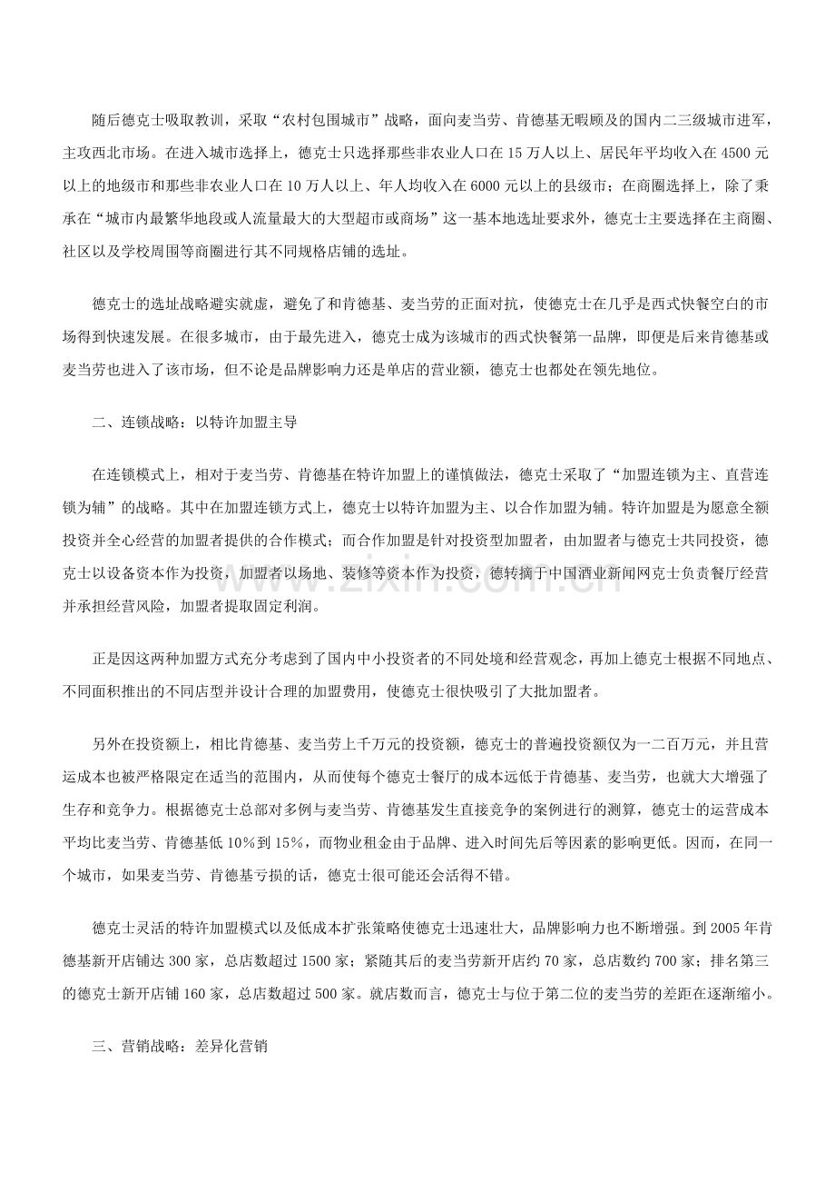 “农村包围城市”、“特许加盟战略”本身就是德克士与麦当劳、肯德基进行差异化竞争的重要策略。除此以外,德克士在产品开发、促销方式等方面相比麦当劳、肯德基等洋快餐严格执行的“千店一面”更具有个性化特色。