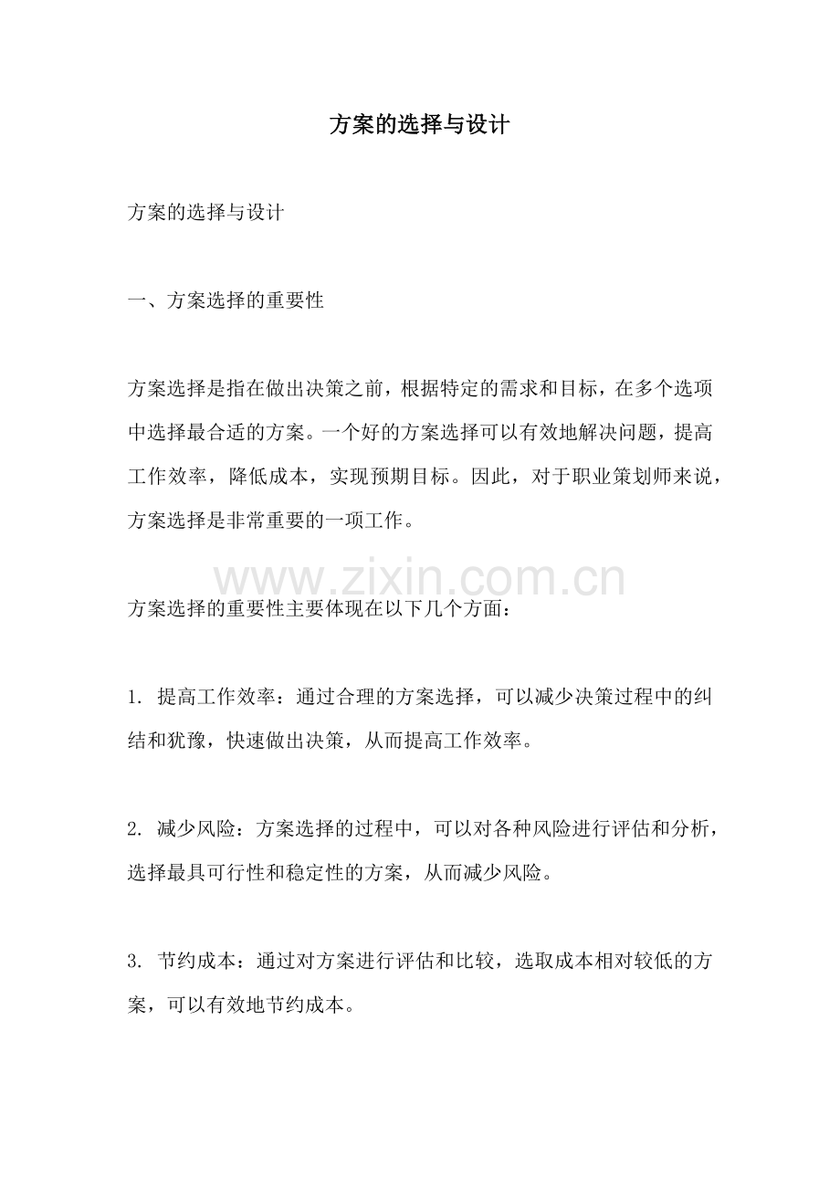 方案选择是指在做出决策之前,根据特定的需求和目标,在多个选项中选择最合适的方案。一个好的方案选择可以有效地解决问题,提高工作效率,降低成本,实现预期目标。因此,对于职业策划师来说,方案选择是非常重要的一项工作。