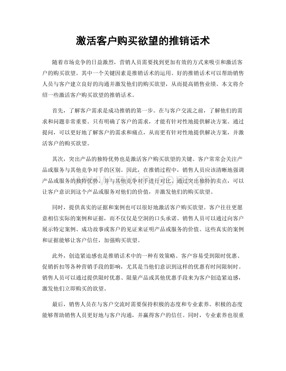 总之,激活客户购买欲望是成功营销的关键。通过了解客户需求、突出产品优势、提供证据和案例、创造紧迫感以及保持积极的态度和专业素养,销售人员可以更好地激活客户的购买欲望。这些推销话术将帮助销售人员更有效地与客户沟通,提高销售业绩。通过专业的推销话术和良好的沟通技巧,销售人员可以更好地满足客户需求,从而成功推动销售。