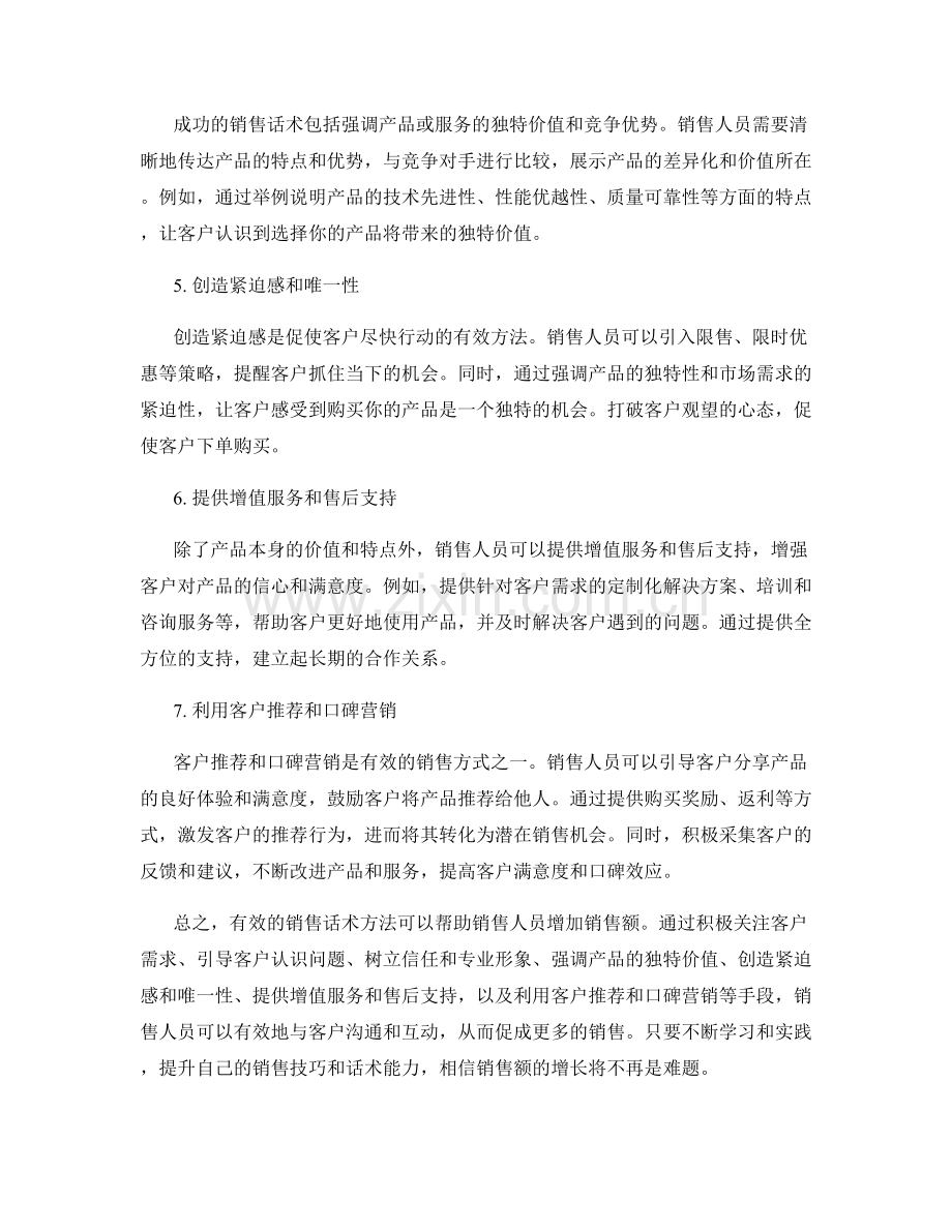 总之,有效的销售话术方法可以帮助销售人员增加销售额。通过积极关注客户需求、引导客户认识问题、树立信任和专业形象、强调产品的独特价值、创造紧迫感和唯一性、提供增值服务和售后支持,以及利用客户推荐和口碑营销等手段,销售人员可以有效地与客户沟通和互动,从而促成更多的销售。只要不断学习和实践,提升自己的销售技巧和话术能力,相信销售额的增长将不再是难题。