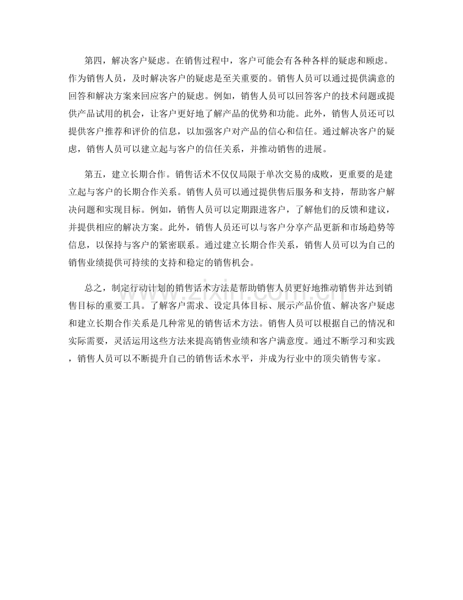 总之,制定行动计划的销售话术方法是帮助销售人员更好地推动销售并达到销售目标的重要工具。了解客户需求、设定具体目标、展示产品价值、解决客户疑虑和建立长期合作关系是几种常见的销售话术方法。销售人员可以根据自己的情况和实际需要,灵活运用这些方法来提高销售业绩和客户满意度。通过不断学习和实践,销售人员可以不断提升自己的销售话术水平,并成为行业中的顶尖销售专家。