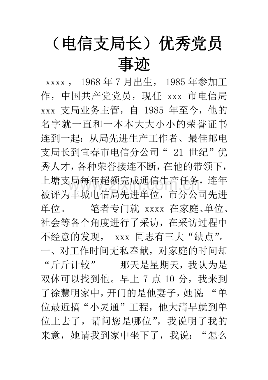 xxxx , 1968 年 7 月出生, 1985 年参加工作,中国共产党党员,现任 xxx 市电信局 xxx 支局业务主管,自 1985 年至今,他的名字就一直和一本本大大小小的荣誉证书连到一起:从局先进生产工作者、最佳邮电支局长到宜春市电信分公司“ 21 世纪”优秀人才,各种荣誉接连不断,在他的带领下,上塘支局每年超额完成通信生产任务,连年被评为丰城电信局先进单位,市分公司先进单位。 笔者专门就 xxxx 在家庭、单位、社会等各个角度进行了采访,在采访过程中不经意的发现, xxx 同志有三大“缺点”。一、对工作时间无私奉献,对家庭的时间却“斤斤计较” 那天是星期天,我认为是双休可以找到他。早上 7 点 10 分,我来到了徐慧明家中,开门的是他妻子,她说:“单位最近搞“小灵通”工程,他大清早就到单位上去了,请问您是哪位”,我说明了我的来意,她请我到家中坐下了,我说:“怎么这么早就走了,我都特意早点来的”,他妻子告诉我:“他很少在家中,你有事到单位上准能找到他”。我的到来把他的小儿子吵醒了。“叔叔好”,他儿子很懂事的叫了我一声。“您爸爸疼你吗?”“他,他很疼我,但他经常骗我”。“为什么说你爸爸会骗你呢?”“上次我过生日,他说了带我上街买玩具的,可是一早到所里去后,很晚才回家,把我的生日都给忘了。”她妻子接着说:“他只顾上班,你看,今天是双休日,我本想一家三口一起逛逛街,一起吃顿饭,我们很久都没一家三口上街了,不过这些年来都习惯了,有时碰到抢修线路,或是遇到什么紧急情况,或半夜出门,他干脆睡在所里,有一次……。说着说着,她的眼睛有些红了,眼圈里似有泪水在滚动,那是前年 9 月,徐慧明的妻子患重病(绒癌)在南昌住院化疗,正需要有人在身边看护照应的时候,恰逢全省百万放号大行动关键时刻,而当时的上塘支局也正处于杆线工程的紧张时期,许多社会关系和工作矛盾等着他去协调解决,为了不影响工程进度,耽误放号时机,徐慧明同志把妻子安排住院后,当天就匆匆赶回单位。年幼的儿子还在幼儿园,母亲身体又不好,为不影响到工作,他只好把小孩放在年迈的岳母家看护。笔者也感到,时间给她的真的太少。二、对下属关心细微,对自己却过于苛刻 在徐慧明家坐了近一个小时,也算有些收获,跟着我来到所里,值班室里没见到徐慧明。只看到我的一位朋友袁猛,他告诉我:“早上建新机房有警报,他去机房了”,既然来了,我就干脆坐下来等,总不能空手而归吧,于是跟这位朋友聊了起来,我叫他介绍一下徐慧明。小袁说:“我们徐局长人很好,管理虽然很严格,但不专横;友善却不放纵;工作能以情动人,以理服人,要求他人做到的自己先做到,以制度约束大家。还经常与我们谈心,关心、体贴、帮助解决我们的生活中的困难,因为我们外地的员工比较多,他担心我们没地方玩,他用获“先进单位”得到的奖金添置了家电、乒乓球等文体用品,逢年过节,他总是先安排我们外地人回家过节,自己却顶班坚守工作岗位。”谈到这,小袁还细声的跟我说:“跟他干,我们放心,好多同志干了不久就往市局里调去了,有的还当了负责人”,小袁的话道出一个道理,整体工作上去了,个人的成绩也就更明显,市局肯定是要工作好的同志吗!接下来小袁又说:他呀,整个一大忙人,通常早上第一个到所里来,整理一下前一天下发的文件和前一天完成任务的情况,再准备当天的工单和计划一下当天要完成的任务,把计划整齐的挂在墙上,大家一上班便一目了然。下午我们把任务完成情况报回所里,他又复查一遍,然后最后一个离开所里。他是我们的负责人,有时却象是我们大家的“秘书”。刚说到这,徐慧明正好回来了,通过与他的一些谈话,我总结了他的第三个缺点。三、对工作兢兢业业,对客户和蔼友善,对事情却总要抛根问底,追出个结果。 在上塘地区,徐慧民的声誉很好,一是他的工作成绩非常出色,从 95 年上塘只有几百部电话发展到现在 7 千多部电话,年年都在提高。特别是 2000 年 5 月份,徐慧明率领支局员工用 22 天的时间放号 100 3部,创造了江西电信农村支局所业务发展史上的“深圳速度”,这几年来,通过徐慧明成功组织的多次业务发展促销活动和与当地政府、社会各界建立的良好关系,上塘支局每年净增放号达 2000 户以上,业务收入净增 130-140 万元,各项成绩都摆在那。第二,说到徐慧明,当地百姓都竖起大拇指,特别是客户熊某,去年 12 月份,熊某到所里去缴电话费,发现当月话费高达 1000 多元,非常生气,认定是被盗打或者计费当中出错了,拒绝缴费,还叫聚了自己家中的 5 兄弟,一伙人在营业所内大声喧嚷,引起很多用户观看、议论,造成了一些不良影响。熊某说,近年来,他家中每月电话费总是在 80 元左右,上个月 300 元我都觉得很高,还没有仔细查清楚,现在又 1000 多元。况且话费中绝大部分还是信息费,我根本没打什么信息台,肯定是被盗打或者计费出了错。正在争吵之中,徐慧明在外检查刚回来。一听现场情况后,先把人群疏散,并立即作了布置,先倒了杯水给熊某,叫他冷静下来,并立刻派了两名机线员与熊某兄弟去熊某家中检查线路有无被盗打的痕迹,另外叫营业员立刻把熊某当月的话费清单打出来。不到半个小时,两名机线员与熊某的兄弟一起回来了,熊某兄弟也说没有被盗打的现象。再看话费清单,全部是 160 信息台的,而且日期很清楚,经详细的询问,确定是他在外