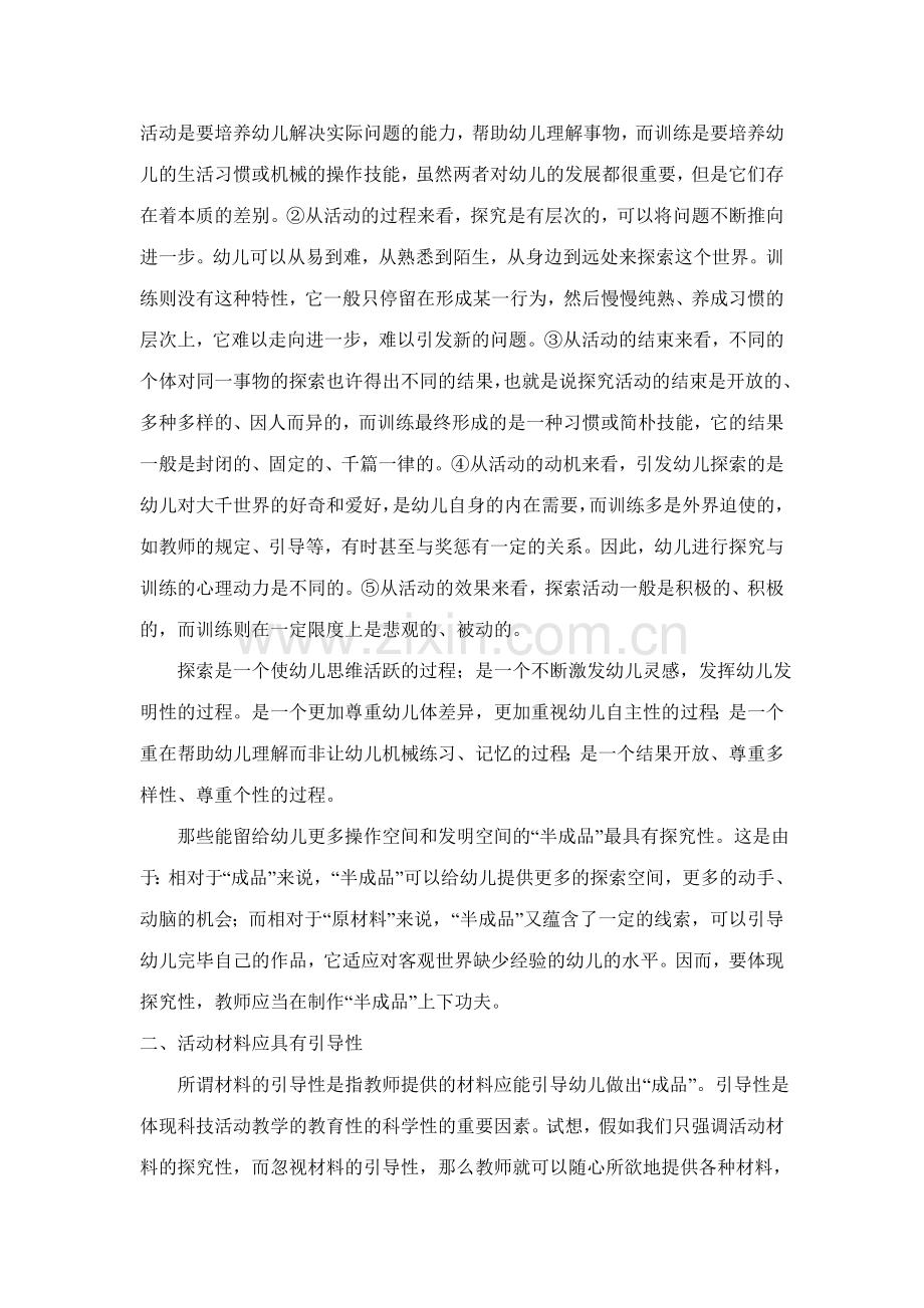 那些能留给幼儿更多操作空间和发明空间的“半成品”最具有探究性。这是由于:相对于“成品”来说,“半成品”可以给幼儿提供更多的探索空间,更多的动手、动脑的机会;而相对于“原材料”来说,“半成品”又蕴含了一定的线索,可以引导幼儿完毕自己的作品,它适应对客观世界缺少经验的幼儿的水平。因而,要体现探究性,教师应当在制作“半成品”上下功夫。