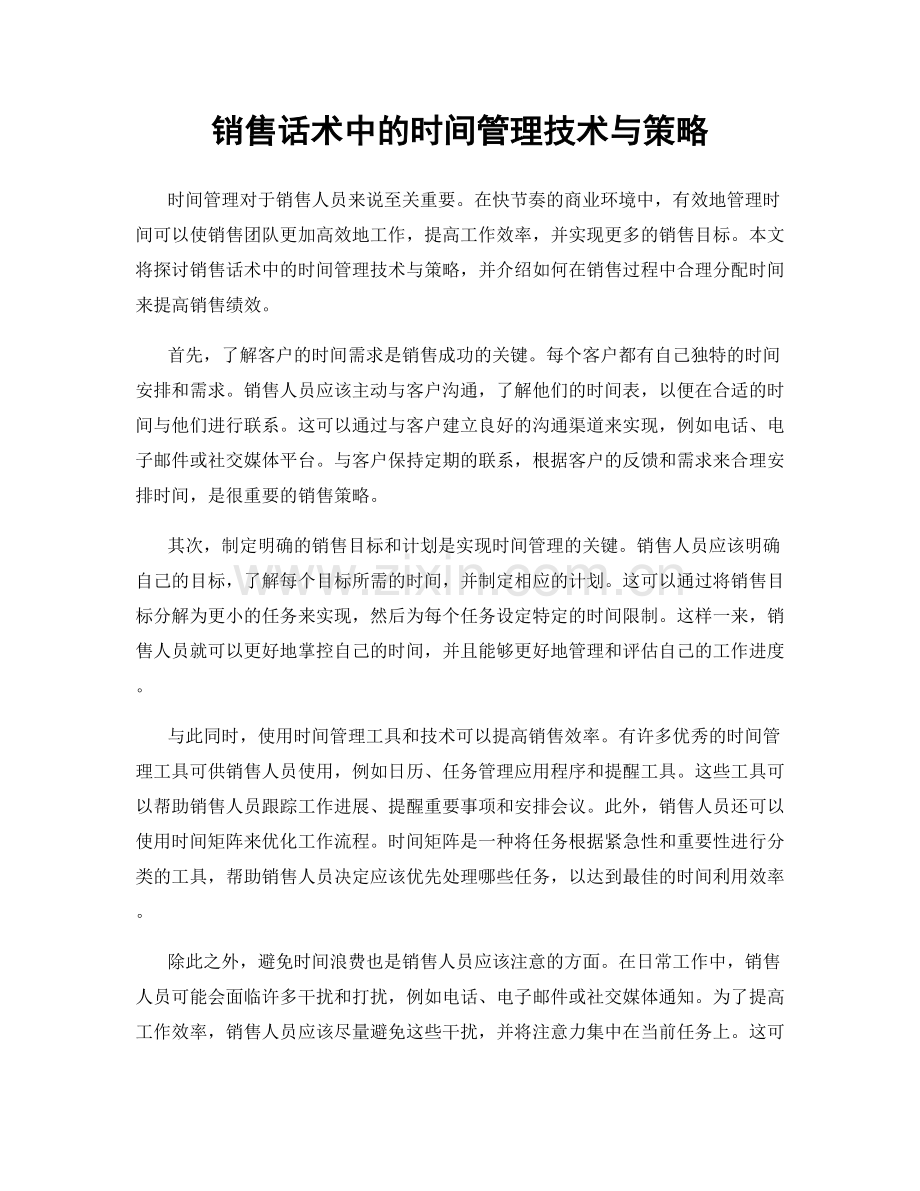 综上所述,时间管理技术和策略在销售话术中起着至关重要的作用。销售人员应该了解客户的时间需求,制定明确的销售目标和计划,并使用有效的时间管理工具和技术。此外,避免时间浪费和持续学习提升自己的销售技能也是非常重要的。只有合理分配时间和高效管理时间,销售人员才能更好地实现销售目标,提高销售绩效。时间管理不仅是个人发展的重要因素,也是整个销售团队成功的关键所在。