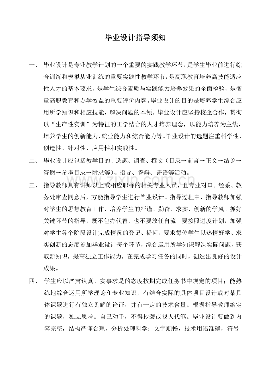 一、 毕业设计是专业教学计划的一个重要的实践教学环节,是学生毕业前进行综合训练和模拟从业训练的重要实践性教学环节,是高职教育培养高技能适应性人才的基本要求,是学生综合素质与实践能力培养效果的全面检验,是衡量高职教育和办学效益的重要评价内容。毕业设计的目的是培养学生综合应用所学知识和相应技能,解决问题的本领。毕业设计应坚持校企合作,贯彻以“生产性实训”为特征的工学结合的人才培养理念,以能力培养为主线,培养学生的创新能力、就业能力和综合能力等。毕业设计的选题注重科学性、创造性、针对性、应用性和实践性。