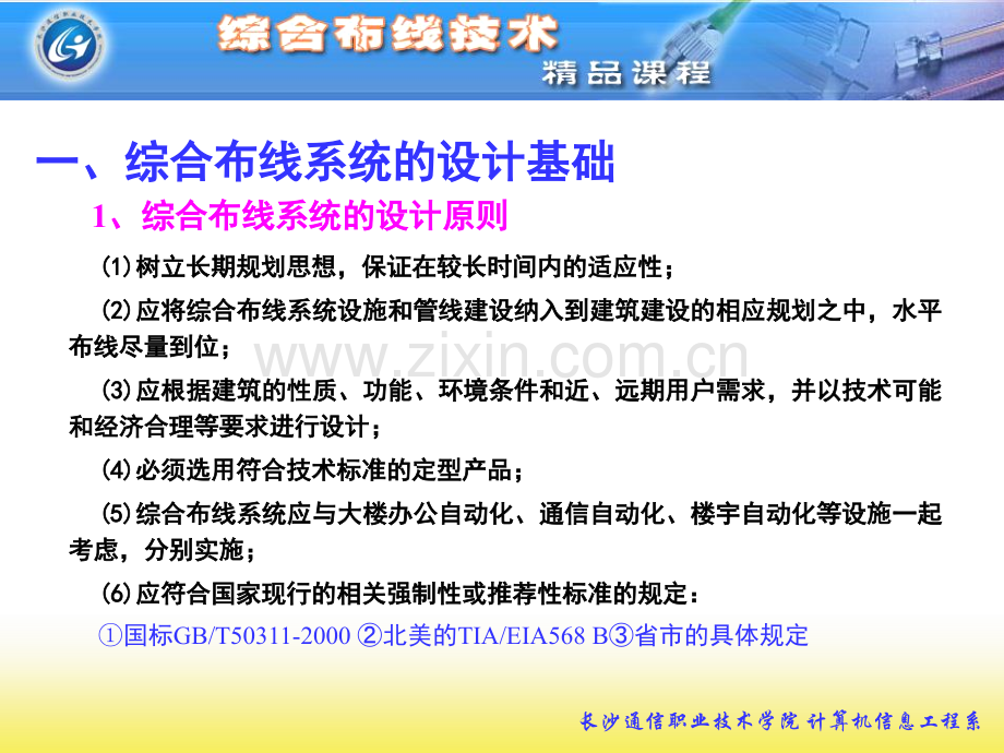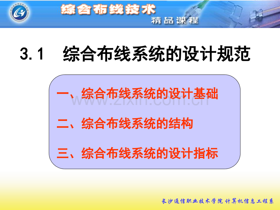 长沙通信职业技术学院 计算机信息工程系一、综合布线系统的设计基础一、综合布线系统的设计基础二、综合布线系统的结构二、综合布线系统的结构三、综合布线系统的设计指标三、综合布线系统的设计指标3.1 3.1 综合布线系统的设计规范综合布线系统的设计规范长沙通信职业技术学院 计算机信息工程系一、综合布线系统的设计基础一、综合布线系统的设计基础 1、综合布线系统的设计原则综合布线系统的设计原则(1)(1)树立长期规划思想,保证在较长时间内的适应性;树立长期规划思想,保证在较长时间内的适应性;(2)(2)应应将将综综合合布布线线系系统统设设施施和和管管线线建建设设纳纳入入到到建建筑筑建建设设的的相相应应规规划划之之中中,水水平平布线尽量到位;布线尽量到位;(3)(3)应应根根据据建建筑筑的的性性质质、功功能能、环环境境条条件件和和近近、远远期期用用户户需需求求,并并以以技技术术可可能能和经济合理等要求进行设计;和经济合理等要求进行设计;(4)(4)必须选用符合技术标准的定型产品;必须选用符合技术标准的定型产品;(5)(5)综综合合布布线线系系统统应应与与大大楼楼办办公公自自动动化化、通通信信自自动动化化、楼楼宇宇自自动动化化等等设设施施一一起起考虑,分别实施;考虑,分别实施;(6)(6)应符合国家现行的相关强制性或推荐性标准的规定:应符合国家现行的相关强制性或推荐性标准的规定:国标GB/T50311-2000 北美的TIA/EIA568 B省市的具体规定长沙通信职业技术学院 计算机信息工程系一、综合布线系统的设计基础一、综合布线系统的设计基础 2、综合布线系统的设计步骤综合布线系统的设计步骤 第一步:分析用户需求;第二步:获取建筑物平面图;第三步:进行系统结构设计;第四步:进行布线路由设计;第五步:作可行性论证;第六步:绘制综合布线系统施工图;第七步:编制综合布线系统概预算。长沙通信职业技术学院 计算机信息工程系一、综合布线系统的设计基础一、综合布线系统的设计基础 3、用户需求分析用户需求分析 确定工程实施的范围(包括建筑物数量,各类信息点数量及分布情况);确定系统的类型(是否包括数据、语音、有线电视、闭路视频监控等系统);确定系统各类信息点的接入要求(接入设备类型和服务要求);查看现场,了解建筑物布局(每个房间信息点安装的位置;建筑物预埋的管槽分布情况;楼层内布线走向;建筑物内任何两个信息点之间的最大距离;建筑物垂直走线情况;建筑物之间预埋的管槽情况及布线走向;有什么特殊要求或限制)。长沙通信职业技术学院 计算机信息工程系二、综合布线系统的结构二、综合布线系统的结构 建筑与建筑群综合布线系统敷设结构图 长沙通信职业技术学院 计算机信息工程系1 综合布线系统的结构原理综合布线系统的结构原理 综合布线系统广泛采用开放式星型结构。由各个相对独立的部件组成,改变、增加或重组其中的一个布线部件并不会影响其它子系统。3个布线子系统连接在一起形成下图所示的布线原布线原理图理图。长沙通信职业技术学院 计算机信息工程系 综合布线系统通常采用综合布线系统通常采用分层星型拓扑结构分层星型拓扑结构,如图所示:,如图所示:2 综合布线系统的拓扑结构综合布线系统的拓扑结构长沙通信职业技术学院 计算机信息工程系3 综合布线系统的接口综合布线系统的接口 位于每个布线子系统的端部,如图所示,用以连接有关设备。其连接方式有:互连互连(即线对直接连接)或交接交接(即线对交叉连接)。长沙通信职业技术学院 计算机信息工程系4 建筑物综合布线系统的结构建筑物综合布线系统的结构 长沙通信职业技术学院 计算机信息工程系5 综合布线系统的配置综合布线系统的配置 (1 1)线缆长度限值)线缆长度限值 长沙通信职业技术学院 计算机信息工程系5 综合布线系统的配置综合布线系统的配置 (2 2)配线架配线架 通常,建筑物的每层楼设置一个配线架。当楼层的面积超过1000m2 时,可以增加配线架。当楼层的信息插座很少时,也可以几层楼合并设置配线架。长沙通信职业技术学院 计算机信息工程系 常见BD-FD配置结构图 长沙通信职业技术学院 计算机信息工程系建建筑筑群群综综合合布布线线系系统统标标准准C CD D-B BD D-F FD D配配置置结结构构图图长沙通信职业技术学院 计算机信息工程系5 综合布线系统的配置综合布线系统的配置 (3 3)信息插座信息插座 对于使用功能比较明确的专业性建筑物,信息插座的布置可 按实际需要确定。远期机房的水平电缆可暂不布线,将需要的容量预留在FD 内,待确定使用对象后进行二次装修时再行布线。对于房地产部门开发的写字楼、综合楼等商用建筑物,宜采 用开放办公室综合布线结构,并符合相关规定(见下页)。长沙通信职业技术学院 计算机信息工程系 采用多用户信息插座采用多用户信息插座时,多用户插座宜安装在墙面或柱子等固定结构上,每一多用户信息插座包括适当的备用量在内,最多包含12个信息插座。各段线缆长度应符合下表的规定各段线缆长度应符合下表的规定:相关规定相关规定电缆总长度电缆总长度(m m)水平布线电缆水平布线电缆H H (m m)工作区电缆工作区电缆W W (m m)交接间跳线和设备电缆交接间跳线和设备电缆D D (m m)100 100 9090 3 3 7 7 9999 8585 7 7 7 7 9