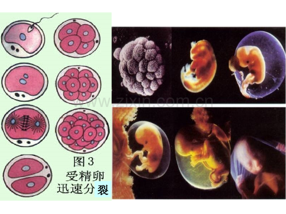 裂裂胚胚 胎胎细细胞胞胞胞细细红红(合成运输氧的血红蛋白)(合成运输氧的血红蛋白)心肌细胞心肌细胞(合成行使运动功能的蛋白质)(合成行使运动功能的蛋白质)红细胞红细胞肌肉细胞肌肉细胞脂肪细胞脂肪细胞神经细胞神经细胞骨细胞骨细胞平滑肌组织平滑肌组织上皮细胞上皮细胞受精卵受精卵早期胚胎早期胚胎?结果 细胞分化对个体发育有什么意义?细胞分化是不细胞分化对个体发育有什么意义?细胞分化是不是人类所特有的呢?细胞分化的结果是什么?是人类所特有的呢?细胞分化的结果是什么?讨论讨论 细胞分化是个体发育的基础;是生物界中普遍存在的生命现象;细胞分化是个体发育的基础;是生物界中普遍存在的生命现象;细胞分化使多细胞生物体中的细胞趋向专门化,有利于提高各种生细胞分化使多细胞生物体中的细胞趋向专门化,有利于提高各种生理功能的效率。理功能的效率。一一 细胞分化及其意义细胞分化及其意义1.1.概念:概念:在个体发育中,由一个或一种细胞增殖产生的后在个体发育中,由一个或一种细胞增殖产生的后代,在形态、结构和生理功能上发生稳定性差异的过程。代,在形态、结构和生理功能上发生稳定性差异的过程。2.2.黑色素细胞在体外培养黑色素细胞在体外培养3030多代后仍能合成黑色多代后仍能合成黑色素;离体培养的上皮细胞,始终保持为上皮细胞,而素;离体培养的上皮细胞,始终保持为上皮细胞,而不会变成其他类型的细胞。不会变成其他类型的细胞。3.3.造血干细胞造血干细胞 原红细胞原红细胞 早幼红细胞早幼红细胞 中幼红细胞中幼红细胞 晚幼红细胞晚幼红细胞 成熟红细胞成熟红细胞 死亡死亡下列事实分别说明了细胞分化的哪一特征下列事实分别说明了细胞分化的哪一特征稳定性稳定性稳定性稳定性不可逆性不可逆性不可逆性不可逆性1.1.细胞分化发生在整个生命进程中。细胞分化发生在整个生命进程中。持久性持久性持久性持久性分别是什么生命现象?两者有何分别是什么生命现象?两者有何区别和联系呢?区别和联系呢?细胞分裂细胞分裂细胞分化细胞分化不不同同点点细胞细胞数量数量形态形态结构结构功能功能相相同同点点联联系系增加增加相同相同不变不变差异差异遗传信息都不变遗传信息都不变共同完成生物个体发育过程,分化是共同完成生物个体发育过程,分化是建立在分裂基础上的建立在分裂基础上的问:就一个个体来说,各种细胞具有相同的遗传信息,问:就一个个体来说,各种细胞具有相同的遗传信息,为什么形态、结构和功能却有很大的差异呢?为什么形态、结构和功能却有很大的差异呢?资料:资料:在红细胞中,与血红蛋白合成有关的基因处于在红细胞中,与血红蛋白合成有关的基因处于活动状态,与肌动蛋白(肌细胞中的一种蛋白质)合活动状态,与肌动蛋白(肌细胞中的一种蛋白质)合成有关的基因则处于关闭状态;在肌细胞中则相反。成有关的基因则处于关闭状态;在肌细胞中则相反。分析:分析:1.1.红细胞和肌细胞等体细胞的遗传信息相同吗?红细胞和肌细胞等体细胞的遗传信息相同吗?2.2.红细胞红细胞血红蛋白基因开启血红蛋白基因开启合成血红蛋白合成血红蛋白肌细胞肌细胞肌动蛋白基因开启肌动蛋白基因开启合成肌动蛋白合成肌动蛋白结论:结论:细胞分化是不同细胞中遗传信息的执行细胞分化是不同细胞中遗传信息的执行情况不同导致情况不同导致 (基因的选择性表达)。(基因的选择性表达)。相同。相同。细胞分化是基因选择性表达的结果。细胞分化是基因选择性表达的结果。由于时间、空间的不同,导致不同的基因由于时间、空间的不同,导致不同的基因表达,所以使细胞中所含蛋白质不同,从而表表达,所以使细胞中所含蛋白质不同,从而表现出了不同的形态结构以及生理功能。现出了不同的形态结构以及生理功能。1.1.下列对细胞分化的叙述正确的是下列对细胞分化的叙述正确的是 ()A A细胞分化是遗传物质改变的结果细胞分化是遗传物质改变的结果B B细胞分化发生在从受精卵到胚胎形成的过程细胞分化发生在从受精卵到胚胎形成的过程C C细胞分化从原肠胚后期开始至生命结束细胞分化从原肠胚后期开始至生命结束D D细胞分化是由细胞内的遗传物质调控的细胞分化是由细胞内的遗传物质调控的2.2.人胰岛人胰岛B B细胞能产生胰岛素,但不能产生红细胞中的血红蛋细胞能产生胰岛素,但不能产生红细胞中的血红蛋白,根据此推测人胰岛白,根据此推测人胰岛B B细胞中细胞中 ()A A只有合成胰岛素的基因只有合成胰岛素的基因B B在细胞分化过程中,基因的数目发生了变化在细胞分化过程中,基因的数目发生了变化C C既有合成胰岛素的基因也有合成血红蛋白的基因,但不同既有合成胰岛素的基因也有合成血红蛋白的基因,但不同细胞遗传信息的执行情况不同细胞遗传信息的执行情况不同D D只有合成胰岛素的基因和其他基因,但没有合成血红蛋白只有合成胰岛素的基因和其他基因,但没有合成血红蛋白的基因的基因D DC C2.2.能否让这些高度分化的细胞再具有分裂分化能力呢?能否让这些高度分化的细胞再具有分裂分化能力呢?1.细胞分化具有稳定性、不可逆性,是不是细胞一旦细胞分化具有稳定性、不可逆性,是不是细胞一旦分化就不再具有分裂分化能力了呢?分化就不再