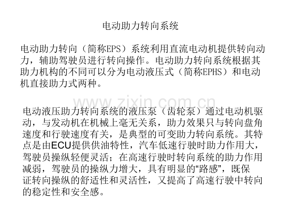 电动助力转向系统电动助力转向(简称EPS)系统利用直流电动机提供转向动力,辅助驾驶员进行转向操作。电动助力转向系统根据其助力机构的不同可以分为电动液压式(简称EPHS)和电动机直接助力式两种。电动液压助力转向系统的液压泵(齿轮泵)通过电动机驱动,与发动机在机械上毫无关系,助力效果只与转向盘角速度和行驶速度有关,是典型的可变助力转向系统。其特点是由ECU提供供油特性,汽车低速行驶时助力作用大,驾驶员操纵轻便灵活;在高速行驶时转向系统的助力作用减弱,驾驶员的操纵力增大,具有明显的“路感”,既保证转向操纵的舒适性和灵活性,又提高了高速行驶中转向的稳定性和安全感。直接助力式电动转向系统的结构和工作原理当转向轴转动时,转矩传感器开始工作,把两段转向轴在扭杆作用下产生的相对转角转变成电信号传给电子控制单元(ECU),ECU根据车速传感器和转矩传感器的信号决定电动机的旋转方向和助力电流的大小,并将指令传递给电动机,通过离合器和减速机构将辅助动力施加到转向系统(转向轴)中,从而完成实时控制的助力转向。1)优点()优点(1)效率高、能量消耗少;)效率高、能量消耗少;(2)系统内部采用刚性连接,反应灵敏,滞后小,驾驶员的)系统内部采用刚性连接,反应灵敏,滞后小,驾驶员的“路感路感”好;好;(3)结构简单,质量小;)结构简单,质量小;(4)系统便于集成,整体尺寸减小;省去了油泵和辅助管路,总布置更加方)系统便于集成,整体尺寸减小;省去了油泵和辅助管路,总布置更加方便;便;(5)无液压元件,对环境污染少。)无液压元件,对环境污染少。2)缺点()缺点(1)直接助力式电动转向系统提供的辅助动力较小,难以用于大型车辆;)直接助力式电动转向系统提供的辅助动力较小,难以用于大型车辆;(2)减速机构、电动机等部件会影响汽车的操纵稳定性,正确匹配整车性能)减速机构、电动机等部件会影响汽车的操纵稳定性,正确匹配整车性能至关重要;至关重要;(3)使用电动机、减速机构和转矩传感器等部件,增加了系统的成本。)使用电动机、减速机构和转矩传感器等部件,增加了系统的成本。四轮转向系统汽车的四轮转向(简称4WS)是指汽车在转向时,4个车轮都可相对车身主动偏转,使之起到转向作用,以改善汽车的转向机动性能。按照后轮转向机构控制和驱动方式的不同,四轮转向可分为机械式、液压式、电控机械式、电控液压式和电控电动式等几种类型。目前使用最广泛的4WS系统为电控液压式,主要用于前轮采用液压助力转向系统的汽车中。线控转向系统线控转向系统用传感器记录驾驶员的转向意图和车辆的行驶状况,通过数据线将信号传递给车载电脑,电脑据此做出判断并控制液压激励器提供相应的转向力,使转向轮偏转相应角度实现转向。汽车防滑控制系统ABS与ASR汽车防滑控制系统是防止汽车在制动过程中车轮被抱死滑移和汽车在驱动过程中(特别是起步、加速、转弯等)驱动轮发生滑转现象的控制系统。防滑控制系统就是在汽车驱动状态下,将驱动轮滑转率控制在5%15%的最佳范围内。制动防抱死系统是在汽车制动状态下,将车轮滑动率控制在8%35%的最佳范围内。在上述最佳范围内,不仅车轮和地面之间的纵向附着系数较大,而且侧向附着系数的值也较大,保证了汽车的方向稳定性。1制动防抱死系统的基本组成和工作原理制动防抱死系统主要由轮速传感器、制动压力调节器和电子控制器(ECU)等组成。其基本工作原理是,汽车制动时,首先由轮速传感器测出与制动车轮转速成正比的交流电压信号,并将该电压信号送入电子控制器(ECU)。由ECU中的运算单元计算出车轮速度、滑动率及车轮的加、减速度,然后再由ECU中的控制单元对这些信号加以分析比较后,向压力调节器发出制动压力控制指令。使压力调节器中的电磁阀等直接或间接地控制制动压力的增减,以调节制动力矩,使之与地面附着状况相适应,防止制动车轮被抱死。2制动防抱死系统(ABS)的类型及布置形式1)按汽车制动系统分类(1)液压制动系统ABS;(2)气压制动系统ABS;(3)气顶液制动系统ABS。2)按ABS中控制管路(通道)数和传感器数量,又可分为以下6种布置形式(1)四传感器四通道四轮独立控制的ABS(2)四传感器四通道前轮独立后轮低选控制的ABS(3)四传感器三通道前轮独立后轮低选控制的ABS(4)三传感器三通道前轮独立后轮低选控制的ABS(5)四传感器二通道前轮独立控制的ABS(6)四传感器二通道前轮独立后轮低选控制的ABSABS部件的结构及其工作原理1)车轮转速传感器(简称轮速传感器)2)电子控制器(ECU)电子控制器(ECU)是防滑控制系统的控制中枢,其作用是接收来自轮速传感器的感应电压信号,计算出车轮速度,并与参考车速进行比较,得出滑动率S及加减速度,并将这些信号加以分析,对制动压力调节器发出控制指令。3)制动压力调节器制动压力调节器的功用是接收来自ECU的控制指令,控制制动压力的增、减,它是ABS的执行器。(1)循环式制动压力调节器循环式制动压力调节器由电磁阀、液压泵和电动机等部件组成。调节器直接装在汽车原有的制动管路中,通过串联在制动主缸和制动轮缸之间的三位三通电磁阀直接控制轮缸的压力,可以使轮缸的工作处于常规工作状态、增压状态、减压状态或保压状态。三位是指电磁阀有三个不同位置,分别控制轮缸制动压力的增、减或保压,三通是指电磁