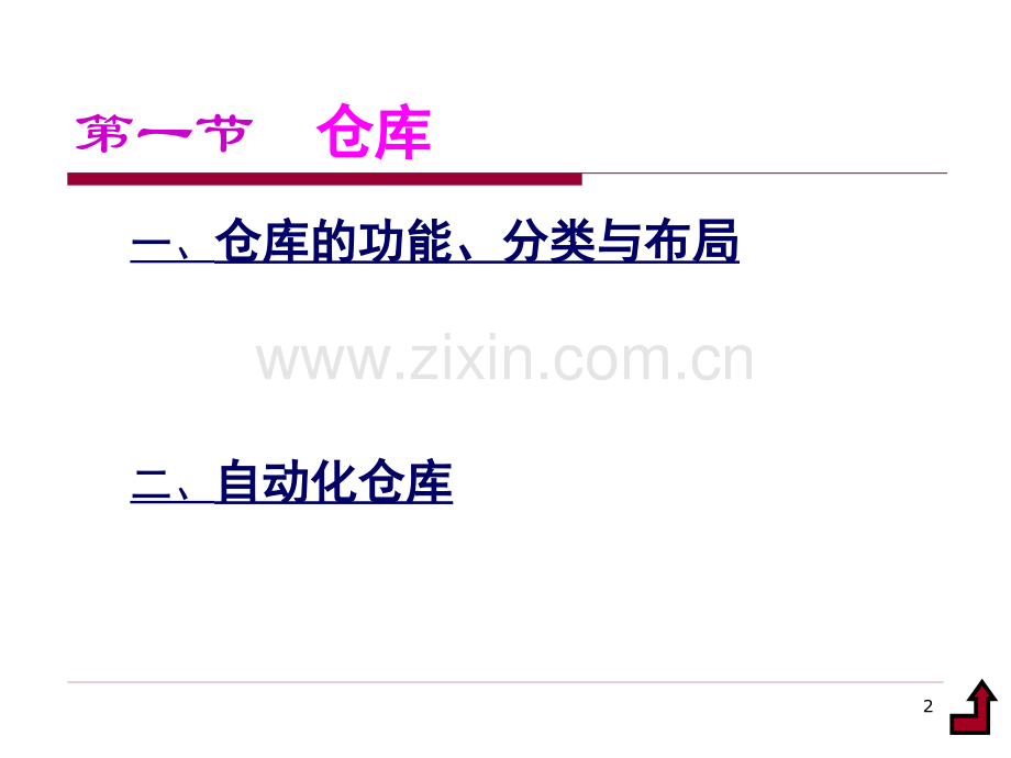 1第三章 现代仓储设施设备与技术现代仓储设施设备与技术第一节 仓库仓库第二节 货架、货箱与托盘货架、货箱与托盘第三节 输送与分拣设备输送与分拣设备第四节 库存管理技术概述库存管理技术概述第第三章章 作业作业2第一节 仓库仓库一、仓库的功能、分类与布局仓库的功能、分类与布局二、自动化仓库自动化仓库3一、仓库的功能、分类与布局仓库的功能、分类与布局1.仓库的功能2.仓库的分类3.仓储作业4.仓库的平面布置41.1.仓库的功能仓库的功能o仓库是储藏保管物品的场所的总称。仓库是储藏保管物品的场所的总称。1)科学储备,提高物品调节水平。2)有效地衔接生产与库存,加快物资周转,降低成本。3)适当加工,衔接产需,合理利用资源,提高效益。4)为企业的生产指挥和决策提供有效的依据。52.2.仓库的分类仓库的分类1 1)按在社会中所处的领域分类)按在社会中所处的领域分类(1)生产仓库(2)流通仓库。又分为:成品仓库 储运仓库 储备仓库2 2)按保管的物品分类)按保管的物品分类(1)原材料、产品仓库(2)商品、物资仓库。又称“商品物资综合仓库”。(3)农副产品仓库 (4)一般专用仓库(5)特种危险品仓库 (6)冷藏冷冻仓库(7)恒温恒湿仓库 (8)战略物资仓库62.2.仓库的分类仓库的分类3 3)按建筑类型分类)按建筑类型分类(1)平房仓库。又称“平库”。(2)楼房仓库。又称“楼库”。(3)筒式仓库。又称“罐式仓库”。(4)高层货架仓库。(5)简易仓库。4 4)按储存物资种类的多少分类)按储存物资种类的多少分类(1)综合仓库 (2)专业仓库5 5)按仓库的产权归属分类)按仓库的产权归属分类(1)自建仓库 (2)租用仓库。73.3.仓储作业仓储作业q仓储作业一般包括收货、存货、取货、发货等仓储作业一般包括收货、存货、取货、发货等环节。环节。84.4.仓库的平面布置仓库的平面布置q仓库的功能区一般包括进货区、入库办理区、储存区、仓库的功能区一般包括进货区、入库办理区、储存区、拣选区、分类区、流通加工区、发货储存区、发货区、拣选区、分类区、流通加工区、发货储存区、发货区、发货办理区、计算机控制中心等。发货办理区、计算机控制中心等。q布置时要考虑区与区之间以及区内的空间关系,即考虑布置时要考虑区与区之间以及区内的空间关系,即考虑商品、资材(货品箱、托盘、料箱)、废弃物和人员之商品、资材(货品箱、托盘、料箱)、废弃物和人员之间的移动路线(简称动线)。动线设计必须合理、完整,间的移动路线(简称动线)。动线设计必须合理、完整,不能发生迂回、绕远、相互干扰等现象。不能发生迂回、绕远、相互干扰等现象。如图如图3-13-1示示。9图图3-1 3-1 仓库平面布置示意图仓库平面布置示意图10二、自动化仓库自动化仓库1.自动化仓库的作用和意义2.自动化仓库的构成3.自动化仓库系统的设计111.1.自动化仓库的作用和意义自动化仓库的作用和意义o自动化立体仓库自动化立体仓库又称立库、高层货架仓库、自动仓储AS/RS。它是一种用高层立体货架储存物资,用计算机系统管理和控制堆垛运输车进行存取作业的仓库。o自动化仓库的功能自动化仓库的功能从单纯的物资储存保管,扩展到物品的接受、分类、计量、包装、分拣、配送等多种功能。12131.1.自动化仓库的作用和意义自动化仓库的作用和意义o与传统仓库相比,自动化仓库能够产生巨大的经济效益与传统仓库相比,自动化仓库能够产生巨大的经济效益和社会效益,主要表现在:和社会效益,主要表现在:1)由于使用高层货架存储货物,存储区可以大幅度地向高空发展,从而能充分利用仓库的地面和空间,可节省库存占地面积,提高空间利用率。2)由于AS/RS使用机械和自动化设备,运行和处理速度快,可提高劳动生产率,降低操作人员的劳动强度。同时,能方便地纳入企业的物流系统,使企业物流更趋合理化。3)能够准确地对各种信息进行存储和管理,可减少货物处理和信息处理中的差错。同时借助于计算机管理还能有效地利用仓库的储存能力,便于清点和盘库,合理减少库存,加快资金周转,节约流动资金,提高仓库的管理水平。142.2.自动化仓库的构成自动化仓库的构成1 1)货物储存系统)货物储存系统 由立体货架的货格(托盘或货箱)组成。货架按照排、列、层组合构成立体仓库储存系统。2 2)货物存取和传送系统)货物存取和传送系统 承担货物存取、出入仓库的功能,由有轨或无轨堆垛机、出入库输送机、装卸机械等组成。3 3)控制和管理系统)控制和管理系统 有的仓库只采取对存取堆垛机、出入库输送机的单台PLC控制;有的仓库对各单台机械进行联网控制;更高级的自动化立体仓库采用集中控制、分离式控制和分布式控制,即由管理计算机、中央控制计算机对堆垛机、出入库输送机等直接控制组成控制系统。152.2.自动化仓库的构成自动化仓库的构成4 4)消防系统。)消防系统。自动化仓库大都采用自动消防系统。5 5)照明系统)照明系统6 6)通风及采暖系统)通风及采暖系统7 7)动力系统)动力系统8 8)其他设施。)其他设施。包括给排水设施、避雷接地设施和环境保护设施等。163.3.自动化仓库系统的设计自动化仓库系统的设计q仓库是一个综合系统,其设计过程一般包括以下几个阶仓库是一个综合系统,其设计过程一般包括以下几个阶段:段:1)需求分析(准备阶段)2)确定货物单元形
