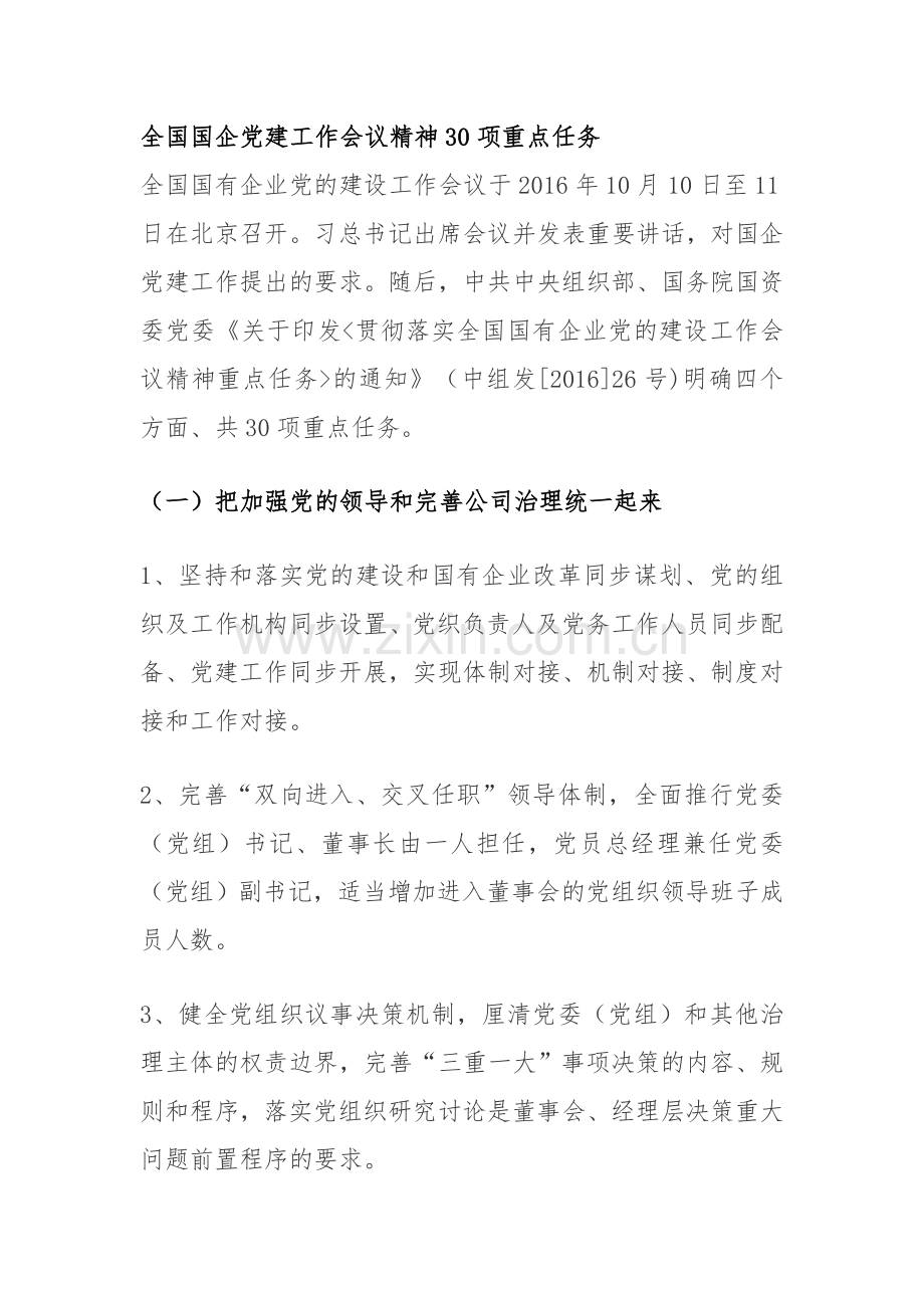 全国国有企业党的建设工作会议于2016年10月10日至11日在北京召开。习总书记出席会议并发表重要讲话,对国企党建工作提出的要求。随后,中共中央组织部、国务院国资委党委《关于印发<贯彻落实全国国有企业党的建设工作会议精神重点任务>的通知》(中组发[2016]26号)明确四个方面、共30项重点任务。