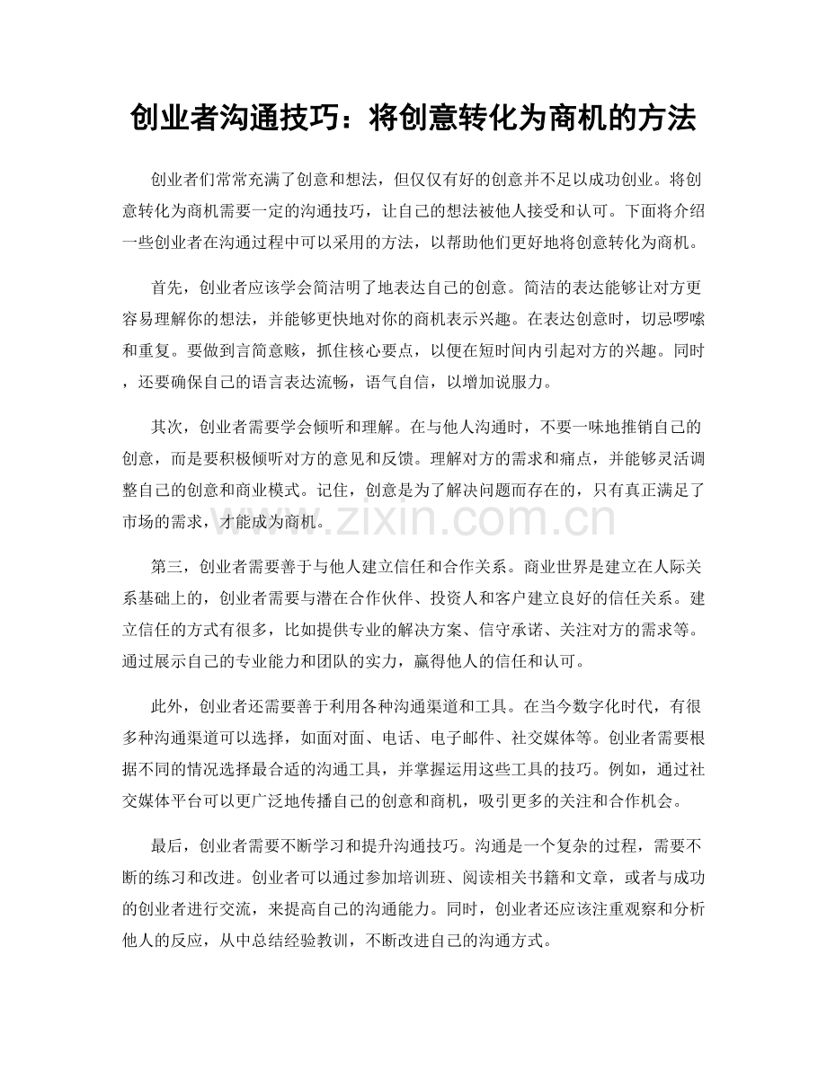 总之,创业者将创意转化为商机需要一定的沟通技巧。简洁明了地表达创意、倾听和理解他人的需求、建立信任关系、善于利用各种沟通渠道和工具,以及不断学习和提升沟通技巧,这些方法都能帮助创业者更好地与他人沟通,从而将创意成功转化为商机。创业路上充满了挑战,但只要掌握好沟通技巧,创业者一定能够将自己的梦想变为现实。