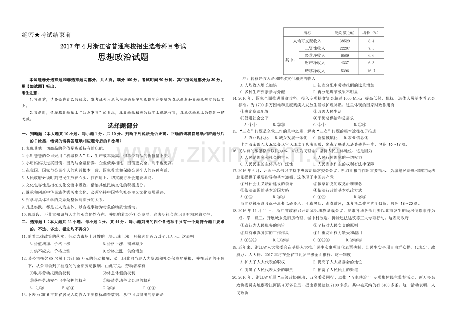 绝密考试结束前 20172017 年年 4 4 月浙江省普通高校招生选考科目考试月浙江省普通高校招生选考科目考试 思想政治试题思想政治试题 本试题卷分选择题和非选择题两部分,共本试题卷分选择题和非选择题两部分,共 6 6 页,满分页,满分 1OO1OO 分,考试时间分,考试时间 9090 分钟。其中加试题部分为分钟。其中加试题部分为 3030 分,分,用【加试题】标出。用【加试题】标出。考生注意:考生注意:1.答题前,请务必将自己的姓名、准考证号用黑色字迹的签字笔或钢笔分剐填写在试题卷和答题纸规定的位置上。2.答题时,请按照答题纸上“注意事项”的要求,在答题纸相应的位置上规范作答,在本试题卷上的作答一律无效。选择题部分选择题部分 一、判断题(一、判断题(本大题共本大题共 1010 小题,每小题小题,每小题 1 1 分,共分,共 1010 分。判断下列说法是否正确,正确的请将答题纸相应题号后分。判断下列说法是否正确,正确的请将答题纸相应题号后的的 T T 涂黑,错误的请将答题纸相应题号后的涂黑,错误的请将答题纸相应题号后的 F F 涂黑涂黑)1.表现其他一切商品的价值是货币特有的职能。2.小明爸爸的公司采用“机器换人”后,生产效率提高,但单位商品的价值量不变。3.小明妈妈决定买国债,因为与金融债券、企业债券相比,国债更安全、利率也更高。4.在我国,国家与公民个人的利益根本一致,国家尊重和保障公民个人的各种利益。5.人民政府必须时刻把民生放在心头、扛在肩上,切实履行社会建设职能。6.文化包容性是指在文化交流中吸收、借鉴其他民族文化的积极成分。7.继承和创新中华民族优秀历史文化,必须坚持中国特色社会主义文化发展道路。8.哲学与具体科学的关系是整体与部分的关系。9.凡是实践,都是以人为主体、以客观事物为对象的物质性活动。10.现阶段,不尊重知识与人才的观念仍然存在,并影响着经济社会发展。这表明社会意识具有相对独立性。二、选择题二、选择题 I I(本大题共(本大题共 2222 小题,每小题小题,每小题 2 2 分,共分,共 4444 分。每小题列出的四个备选项中只有一个是符合题目要求分。每小题列出的四个备选项中只有一个是符合题目要求的,不选、多选、错选均不得分)的,不选、多选、错选均不得分)11.随着二孩政策的落实,劳动力市场上月嫂的工资迅速上涨,月薪达到近万甚至几万元。这表明 A.价值增加,价格上涨 B.价格上涨,需求减少 C.供不应求,价格上涨 D.价格上涨,供给增加 12.某公司拖欠 68 名员工共计 55 万元的劳动报酬,员工因此向当地人力资源和社会保障局举报,并在后者的干预下,从公司领到了被拖欠的全部劳动报酬。由此可见,劳动者享有 取得劳动报酬的权利 休息休假的权利 获得劳动安全卫生保护的权利 提请劳动争议处理的权利 A B.C.D.13.下表为 2016 年某省居民人均收入主要指标调查数据,从中可以得出的结论是 指标 绝对数(元)增长(%)人均可支配收入 38529 8.4 工资性收人 22207 7.5 经营净收人 6589 6.6 财产净收人 4337 6.3 其中:转移净收人 5396 16.7 注:转移净收入是和转移支付相关的收入 A.人均收入增长加快 B.初次分配中劳动报酬的比重增加 C.多种生产要素参与分配 D.再分配调节效果不明显 14.2016 年,国家全面推进脱贫攻坚,投入专项扶贫资金超过 1000 亿元;提高低保、优抚、退休人员基本养老金标准,为 1700 多万困难和重度残疾人发放生活或护理补贴。这里体现的国家财政作用有 决定资源配置 改善人民生活 促进社会公平 平衡总供给和总需求 A.B.C.D.15.“三农”问题是全党工作的重中之重,解决“三农”问题的根本途径在于推进 A.农业现代化 B.城乡发展一体化 C.新型城镇化 D.农业信息化 十二届全国人大五次会议审议通过了民法总则,完成了编纂民法典的第一步。回答 1617 题。16.民法典的编纂恪守以民为本、立法为民理念,坚持人民主体地位。这是因为 A.人民是国家和社会的主人 B.人民行使国家的切权力 C.人民民主的主体具有广泛性 D.人民当家作主的权利有法律保障 17.2016 年 6 月,习近平总书记主持中央政治局常委会会议,听取汇报并作出重要指示,为编纂民法典和制定民法总则提供了重要指导和基本遵循。这体现了中国共产党 对社会主义法治建设的领导 依章治党的政党治理理念 依法治国的基本治国方略 依法行政的基本执政方式 A.B.C.D.浙江积极响应习近平总书记的要求,干在实处、走在前列,在各项工作中勇于创新。回答 1820 题。18.2016 年 11 月 11 日,浙江省政府召开治危拆违攻坚战会议,要求各地各部门要以此前发生的民房倒塌事件为戒,举反三,开展城乡危旧房治理、城中村改造、拆除违法述筑等三大专项行动。这表明政府 践行为人民服务的宗旨 坚持对人民负责的原则 具有求真务实的工作作风 注重防止权力缺失和滥用 A.B.C.D.19.近年来,浙江省人大常委会在基层人大推广民生实事项目代表票决制,即民生实亊项目由群众提、代表定、政府办、人大评。2017 年将在全省市县乡三级全面推行。这一制度 A.扩大了人大代表的职权 B.提高了人大常委会的地位 C.明确了人民代表大会的职责 D.拓宽了人民民主的渠道 20.2016 年,浙江省开展“三级政协联动、万名委员同行、助推五水共治”专项集体民主监督活动,两万多名政协委员实地察看江河溪 4 万多公里,提出意见建议 7100 多条,其中被采纳的有 5400 多条