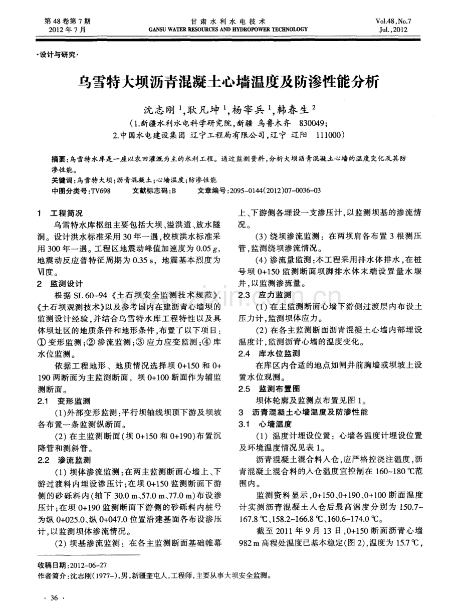 第 4 8卷第 7期 2 0 1 2年 7月 甘 肃 水 利 水 电 技 术 G A NS U WAT E R RE s OU Ra璐 A ND NYI ) ROP OWE R TE C HNOL O GY Vo 1 48 No7 J u 1 , 2 0 1 2 设计与研究 乌雪特大坝沥青混凝土心墙温度及防渗性能分析 沈志刚 , 耿 凡坤 , 杨宰兵 , 韩春 生 ( 1 新疆水利水电科学研究院, 新疆 乌鲁木齐8 3 0 0 4 9 ; 2 中国水电建设集 It i辽宁工程局有限公司, 辽宁 辽阳 1 1 1 0 0 0 ) 摘要: 鸟雪特水库是一座以农田灌溉为主的水利工程。通过监测资料, 分析大坝沥青混凝土心墙的温度变化及其防 渗性能。 关键词: 乌雪特大坝; 沥青混凝土; 心墙温度; 防渗性能 中图分类号: T V 6 9 8 文献标志码: B 文章编号: 2 0 9 5 0 1 4 4 ( 2 0 1 2 ) 0 7 0 0 3 6 0 3 1 工 程简 况 乌雪特水库枢纽主要包括大坝、 溢洪道、 放水隧 洞。设计洪水标准采用 3 0年一遇, 校核洪水标准采 用 3 0 0年一遇。工程 区地震动峰值加速度为 0 0 5 g , 地 震动 反应 普 特征 周 期为 0 3 5 s ,地震 基本 烈度 为 度 。 2监 测设计 根据 S L 6 0 9 4 土石坝安全监测技术规 范 、 土石坝观测技术 以及参考国内在建沥青心墙坝的 监测设计经验 并结合乌雪特水库工程特性以及具 体坝址区的地质条件和地形条件 , 布置了以下项 目: 变形监测; 渗流监测; 应力应变监测; 库 水位监测。 依据工程地形 、地质情况选择坝 0 + 1 5 0和 0 + 1 9 0两断 面为 主监测 断 面 ,坝 0 + 1 0 0断面作 为辅 监 测 断面 2 1 变形监 测 ( 1 ) 外部变形监测 : 平行坝轴线坝顶下游及坝坡 各 布置一条 监测 纵 断面 。 ( 2 ) 在 主 监测 断 面 ( 坝 0 + 1 5 0和 0 + 1 9 0 ) 布置 沉 降管和测斜管。 2 2 渗 流监测 ( 1 ) 坝体渗流监测 : 在两主监测断面心墙上 、 下 游过渡料内埋设渗压计 ; 在坝 0 + 1 5 0监测 断面下游 侧 的砂砾料 内( 轴下 3 O 0 m、 5 7 0 m、 7 7 0 m) 布设渗 压计 : 在坝 0 + 1 9 0监测断面下游侧的砂砾料 内桩号 为纵 0 + 0 2 5 0 、 纵 0 + 0 4 7 0位置沿建基面各布设渗压 计 , 以监测坝体渗流情况。 ( 2 ) 坝基渗流监测 :在各主监测断面基础帷幕 上 、 下游侧各埋设一支渗压计 , 以监测坝基的渗流情 况 。 ( 3 ) 绕坝渗流监测 :在两坝肩各布置 3根测压 管 , 监测绕坝渗流情况。 ( 4 ) 渗流量监测: 本工程采用排水体排水 , 在桩 号 坝 0 + 1 5 0监测断面坝脚排水体末端设置量水堰 井 。 以监测渗 流量 。 2 3应 力监测 ( 1 ) 在主监测 断面心墙下游侧过渡层内布设土 压力计 , 监测坝体应力。 ( 2 )在各主监测断面沥青混凝土心墙 内部埋设 温度 计 监测 沥青心墙 的温度 变化 。 2 4库水 位监 测 在库 区内合适的地点如闸井前胸墙或坝坡上设 置水位观测。 2 5监测 布 置图 坝体轮廓及监测点布置见图 1 。 3沥青 混凝 土心墙温 度及 防渗 性能 3 1 心 墙温 度 ( 1 )温度计埋设位置:心墙各温度计埋设位置 及环境温度情况见表 1 。 沥青混凝土混合料入仓, 应严格控浇注温度 , 沥 青混凝土混合料的人仓温度宜控制在 1 6 0 1 8 0 范 围 内。 监测资料显示 , 0 + 1 5 0 、 0 + 1 9 0 、 0 + 1 0 0断面温度 计 实测沥青 混凝土入仓后最高温度分别为 1 5 0 7 1 6 7 8 、 1 5 8 2 1 6 6 8 、 1 6 0 6 1 7 4 0 。 截至 2 0 1 1 年 9月 1 3日, 0 + 1 5 0断面沥青心墙 9 8 2 m高程处温度已基本稳定( 图 2 ) , 温度为 1 5 7 , 收稿 日期 : 2 0 1 2 0 6 2 7 作者简介: 沈志刚( 1 9 7 7 一 ) , 男, 新疆奎屯人, 工程师, 主要从事大坝安全监测。 3 6 沈 志 冈 。 , 等: 乌 雪 特 大 坝 童 圭 : 堡 堕 竺 塑 坌 第 7期 坝轴线 图 1 监测点布置图 丽 : T1 o +1 5 O 9 8 2 j ) ” T 2 O +1 5 0 9 9 0 2 32 5 1 5 8 4 1 9 3 5 T3 o+ 1 5 O l 0 0 0 2 8 5 0 1 6 7 8 31 2 0 T 4 o +1 5 O 1 01 0 2 86 0 1 5 7 3 2 72 5 T 5 0+1 5 0 1 0 2 0 1 8 7 0 1 61 4 4 3 9 5 , n 0+ 1 9 0 1 01 0 2 6 4 5 1 6 68 2 82 0 0+ 1 0 0 1 01 0 3 06 0 1 7 40 2 76 0 Tl 0 0+ 1 0 0 1 0 2 0 1 8 7 5 1 60 6 一 4 7 6 0 一 日期 图 2 0 + 1 5 0断面沥青心墙位温度过程线 喜 本15 4 窑 矗 渗 压 计 温 度 为 。 c ) ,该 断 回彻 L 、 峒拭 匕 位温 0 度仍 降温过 、沥青J 墙各部位温度仍在 + 1 9 0 0 +1 0 0 和 断 回劭 霄 L 、 辐 亩 p 皿 w 降温过程。 3 N i : 0 + 1 5 0 0 + 1 9 0 IN& 墙上、 下游 湾 混 凝 土垫 层面 上 各 埋 釜 过渡料 内( 基础混凝 土垫层 面上 ) 符埋 又侈 计 c 、 、P 。 、 P ;。 “ 5 。 断 面 下 萼 妻 ;N I N ( It t - F 3 0 滁 + , P P6 0 P 7 m ) 5 ; 7 o 0 +1 m 9 o 7 断 7 0 面m ) 主 宰 2 5 0 4 7 0 翼 基 面 ( 轴 下 m、 m ) 兴 砷 l 芟 z又 侈 心 ( P l 2 n P 1 1 3 n ) 断 。 面 0 + 1 5 0断面 ( 图 3 ) : 随着坝体 的填 辖 : K 位 均 车 - -, - 善 銮 篙 誊 姜 嵩 心墙前 、 确 E N( J : Y r 5 6 ) 相 对 : L 点 羞 化 相 对 平 9 8 4 5 6 m, 沥青 g q 3 2 5 m l l 9 6 f1 2 2 H 嚣 P 3 9 5 nl 计 的 渗 透 水 位 为 9 9 1 , 叻 霄 心 r 、 耐 P 。 4 P 7的 渗 透 水 位 分 别 为 9 8 7 0 1 m、 9 8 6 O 6 m、 g 、 魁 苌 图 3 O + 1 5 O断面渗压计渗透水位过程线 3 7 2 0 1 2年第 7期 甘肃水利水 电技术 第 4 8卷 表 2 0 + 1 5 0断面渗透压力特征值 设的渗压计( P I O 、 P l 1 ) 目前该位置尚无水。 ( 2 ) 坝基帷幕渗流 : 0 + 1 5 0 、 0 + 1 9 0断面帷幕前 、 后 ( 深入基岩 1 0 m)各埋设了 1支渗压计 ( P 1 、 P 2 、 P 8 、 P 9 ) 。 0 + 1 5 0断 面( 图 4 ) : 随着坝体的填筑 , 帷幕前 、 后水位均呈现上升趋势 , 2 0 1 1年 7月 1 5日, 上游集 水井因故停止抽水 。帷幕上游侧渗压计 P 1的渗透 水位剧升 , 这与心墙上游 P 3的变化是一致的( 见表 3 ) 。截至 2 0 1 1 年 9月 2 2日, 上游水位为 9 9 3 2 5 m, 下游水位为 9 8 4 5 6 m, 帷幕前渗压