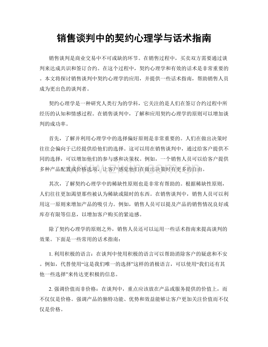 综上所述,契约心理学和话术指南在销售谈判中发挥着至关重要的作用。销售人员应该了解契约心理学的原则,并运用有效的话术指南来提高谈判的效果。通过运用这些技巧,销售人员能够更好地达成共识和签订合约,建立起长期的合作关系。销售谈判不仅仅是一次交易,更是为了实现共赢和持续发展的过程。