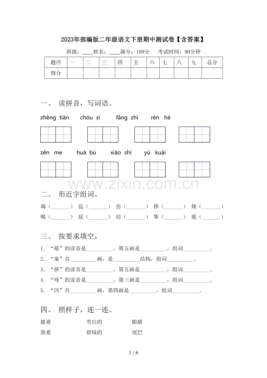 2023年部编版二年级语文下册期中测试卷【含答案】