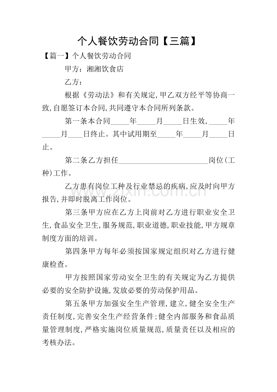 个人餐饮劳动合同【三篇】