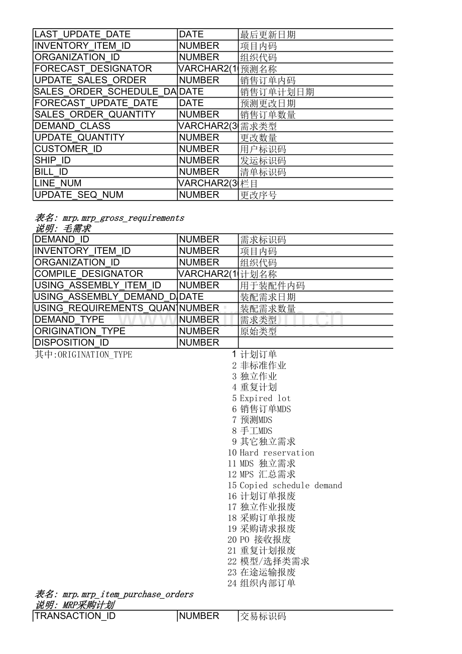 MRPMRP模模块块常常用用表表结结构构表表名名:mrp.mrp_assembly_operationsmrp.mrp_assembly_operations说说明明:计计划划装装配配实实施施表表ORGANIZATION_IDNUMBER组织代码INVENTORY_ITEM_IDNUMBER构成项目内码COMPILE_DESIGNATORVARCHAR2(10)计划员USING_ASSEMBLY_ITEM_IDNUMBER装配件内码OPERATION_SEQ_NUMNUMBER工序号OPTIONAL_COMPONENTNUMBER可选构成数OPERATION_USAGE_QUANTITYNUMBER实施数量OPERATIOP_OFFSET_PERCENTNUMBER补尝百分比WIP_SUPPLY_TYPENUMBER车间供应类型表表名名:mrp.mrp_forecast_itemsmrp.mrp_forecast_items说说明明:预预测测项项目目表表INVENTORY_ITEM_ID NUMBER项目内码ORGANIZATION_ID NUMBER组织代码FORECAST_DESIGNATORVARCHAR(10)预测计划名称表表名名:mrp.mrp_forecast_designatorsmrp.mrp_forecast_designators说说明明:预预测测名名称称表表FORECAST_DESIGNATOR VARCHAR2(10)预测名称ORGANIZATION_ID NUMBER组织代码DESCRIPTION VARCHAR2(50)描述CONSUME_FORECAST NUMBERUPDATE_TYPE NUMBER更改类型DISABLE_DATE DATE失效日期FORECAST_SETVARCHAR2(10)预测集表表名名:mrp.mrp_forecast_datesmrp.mrp_forecast_dates说说明明:预预测测表表TRANSACTION_ID NUMBER交易代码INVENTORY_ITEM_ID NUMBER项目内码ORGANIZATION_ID NUMBER组织代码FORECAST_DESIGNATOR VARCHAR2(10)预测名称CREATION_DATEDATE做预测时间FORECAST_DATE DATE预测开始时间ORIGINAL_FORECAST_QUANTITY NUMBER原始数量CURRENT_FORECAST_QUANTITY NUMBER现在数量CONFIDENCE_PERCENTAGE NUMBER可信度BUCKET_TYPE NUMBER周期类型(1.日,2.周,3.周期)RATE_END_DATE DATE预测结束日期(为空时,只有一个周期)ORIGINATION_TYPE NUMBER原始类型注:数量为一个周期的数量。周期数为:1.当周期类型为日时,为预测起止日之间的工作天数;2.当周期为周时,为预测起止日期所跨的周数;3.当类型为周期时,周期数为起止日期所跨的周期数(1个季度共13周分为3个周期,分别为445周)在计算时可分别与BOM模块的bom_calendar_dates,bom_cal_week_start_dates,bom_period_start_dates关联进行计算表表名名:mrp.mrp_forecast_updatesmrp.mrp_forecast_updates说说明明:预预测测更更改改TRANSACTION_ID NUMBER交易代码LAST_UPDATE_DATE DATE最后更新日期INVENTORY_ITEM_ID NUMBER项目内码ORGANIZATION_ID NUMBER组织代码FORECAST_DESIGNATOR VARCHAR2(10)预测名称UPDATE_SALES_ORDER NUMBER销售订单内码SALES_ORDER_SCHEDULE_DATEDATE销售订单计划日期FORECAST_UPDATE_DATE DATE预测更改日期SALES_ORDER_QUANTITY NUMBER销售订单数量DEMAND_CLASS VARCHAR2(30)需求类型UPDATE_QUANTITY NUMBER更改数量CUSTOMER_ID NUMBER用户标识码SHIP_ID NUMBER发运标识码BILL_ID NUMBER清单标识码LINE_NUM VARCHAR2(30)栏目UPDATE_SEQ_NUMNUMBER更改序号表表名名:mrp.mrp_gross_requirementsmrp.mrp_gross_requirements说说明明:毛毛需需求求DEMAND_ID NUMBER需求标识码INVENTORY_ITEM_ID NUMBER项目内码ORGANIZATION_ID NUMBER组织代码COMPILE_DESIGNATOR VARCHAR2(10)计划名称USING_ASSEMBLY_ITEM_ID NUMBER用于装配件内码USING_ASSEMBLY_DEMAND_DATE DATE装配需求日期USING_REQUIREMENTS_QUANTITYNUMBER装配需求数量DEMAND_TYPE NUMBER需求类型ORIGINATION_TYPE NUMBER原始类型DISPOSITION_ID NUMBER其中:ORIGINATION_TYPE 1 计划订单2 非标准作业3 独立作业4 重复计划5 Expired lot6 销售订单MDS7 预测MDS8 手工MDS9 其它独立需求10 Hard reservation11 MDS 独立需求12 MPS 汇总需求15 Copied schedule demand16 计划订单报废17 独立作业报废18 采购订单报废19 采购请求报废20 PO 接收报废21 重复计划报废22 模型/选择类需求23 在途运输报废24 组织内部订单表表名名:mrp.mrp_item_purchase_ordersmrp.mrp_item_purchase_orders说说明明:MRPMRP采采购购计计划划TRANSACTION_ID NUMBER交易标识码INVENTORY_ITEM_ID NUMBER项目内码ORGANIZATION_ID NUMBER组织代码COMPILE_DESIGNATOR VARCHAR2(10)计划名称PURCHASE_ORDER_ID NUMBER采购订单标识码VENDOR_ID NUMBER供应商标识码ORDER_TYPE NUMBER订单类型DELIVERY_SCHEDULE_DATE DATE计划交付日期PO_NUMBER VARCHAR2(62)采购订单号DELIVERY_BALANCE NUMBEREXPECTED_SCRAP_QUANTITY NUMBER预计报废数量UOM_CODE VARCHAR2(3)单位PO_UOM_DELIVERY_BALANCE NUMBERDELIVERY_PRICE NUMBER交付价格DELIVERY_STATUS_TYPE NUMBER交付状态PURCH_LINE_NUM NUMBER采购行栏目号LINE_ID NUMBER行号FIRM_PLANNED_STATUS_TYPE NUMBERDELIVERY_NEED_DATE DATE交付到岸日期REVISION VARCHAR2(3)版本PRINT_DATE DATE制单日期其中:ORDER_TYPE1 采购订单(PO)2 采购请求(PR)3 独立作业4 建议汇总重复计划5 计划订单7 非标准作业8 采购订单接收11 在途运输12 在途接收13 建议重复计划14 按产品独立作业15 按产品非标准作业16 按产品重复计划17 按产品计划订单表表名名:mrp.mrp_item_wip_entitiesmrp.mrp_item_wip_entities说说明明:MRPMRP项项目目离离散散作作业业INVENTORY_ITEM_ID NUMBER项目内码ORGANIZATION_ID NUMBER组织代码COMPILE_DESIGNATOR VARCHAR2(10)计划名称WIP_ENTITY_ID NUMBER任务令内码WIP_ENTITY_NAME VARCHAR2(240)任务令号JOB_QUANTITY NUMBER作业数量QUANTITY_COMPLETED NUMBER完工数量QUANTITY_SCRAPPED NUMBER报废数量EXPECTED_SCRAP_QUANTITY NUMBER允许报废数量SCHEDULE_COMPLETION_DATE DATE计划完工日期FIRM_PLANNED_STATUS_TYPENUMBERSTART_DATE DATE开工日期STATUS_CODE NUMBER状态REVISIONVARCHAR2(3)版本表表名名:mrp.mrp_plansmrp.mrp_plans说说明明:计计划划表表ORGANIZATION_ID NUMBER组织代码COMPILE_DESIGNATOR VARCHAR2(10)计划名称CURR_SCHEDULE_DESIGNATOR VARCHAR2(10)当前计划名称CURR_OPERATION_SCHEDULE_TYPENUMBER当前操作计划类型CURR_PLAN_TYPE NUMBER当计划计划类型CURR_OVERWRITE_OPTION NUMBERCURR_APPEND_PLANNED_ORDERS NUMBERCURR_SCHEDULE_TYPE NUMBERCURR_CUTOFF_DATE DATECURR_PART_INCLUDE_TYPE NUMBERCURR_PLANNING_TIME_FENCE_FLAGNUMBERCURR_DEMAND_TIME_FENCE_FLAG NUMBERCURR_CONSIDER_RESERVATIONS NUMBERCURR_PLAN_SAFETY_STOCK NUMBERCURR_CONSIDER_WIP NUMBERCURR