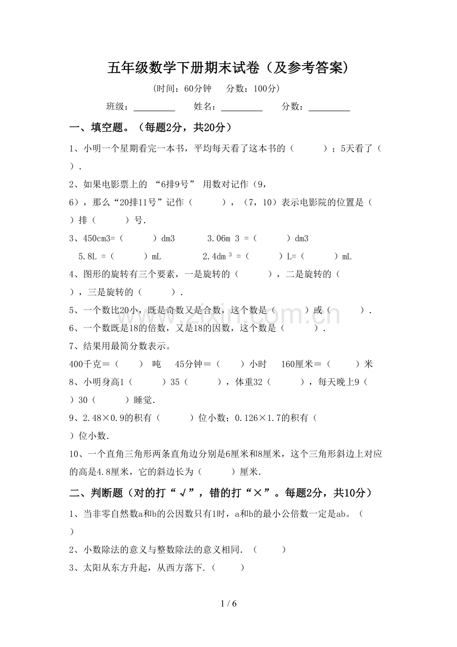 五年级数学下册期末试卷(及参考答案)