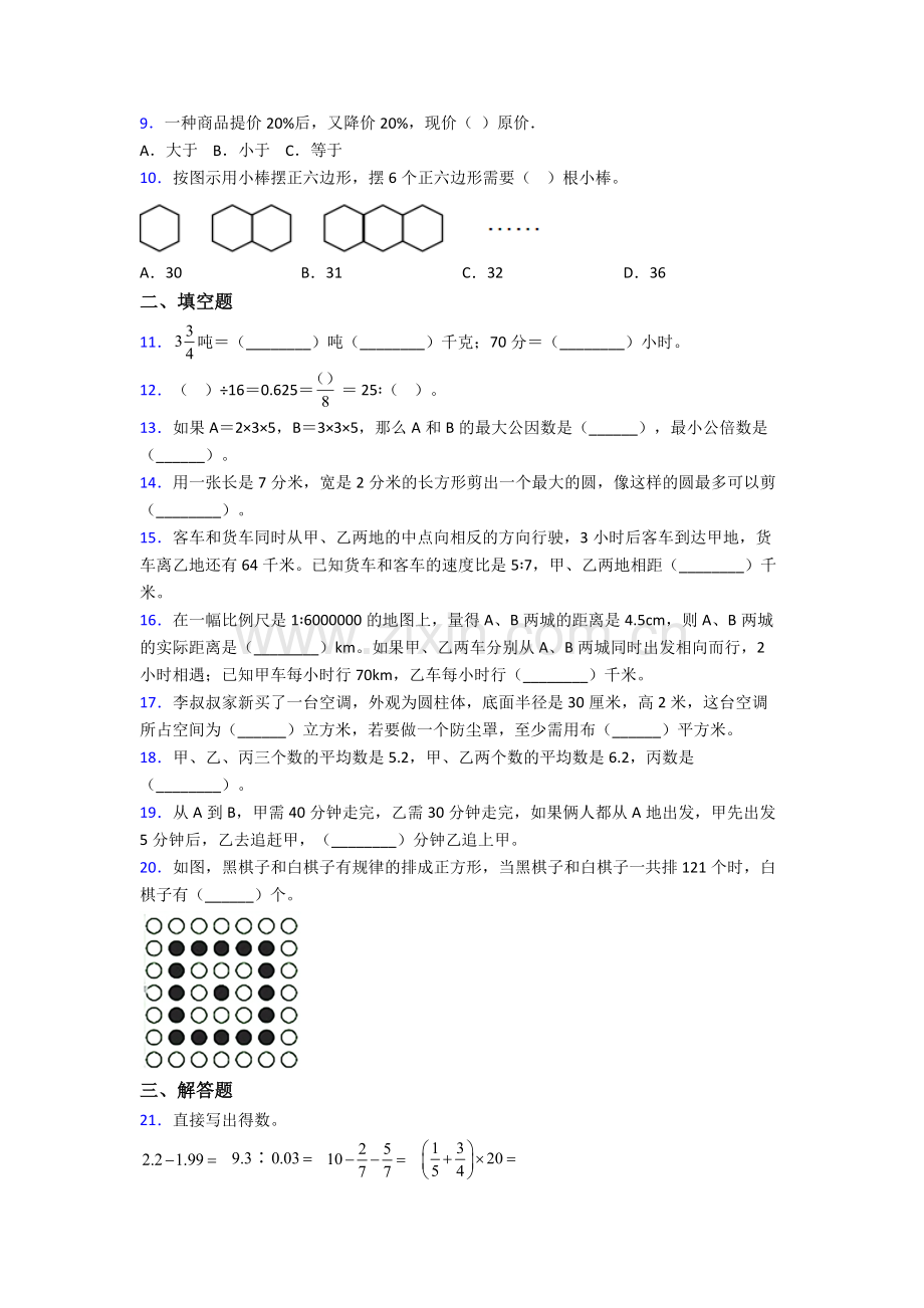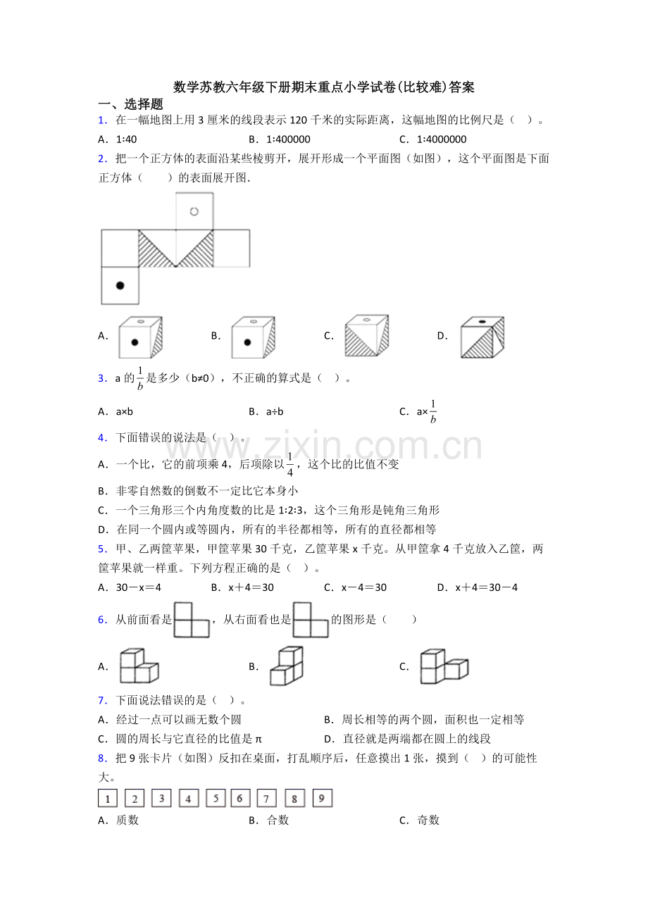 数学苏教六年级下册期末重点小学试卷(比较难)答案