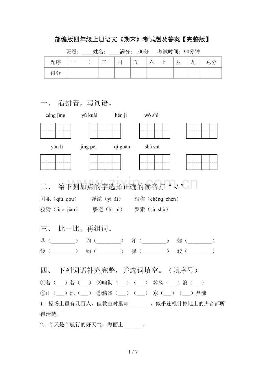 部编版四年级上册语文《期末》考试题及答案【完整版】