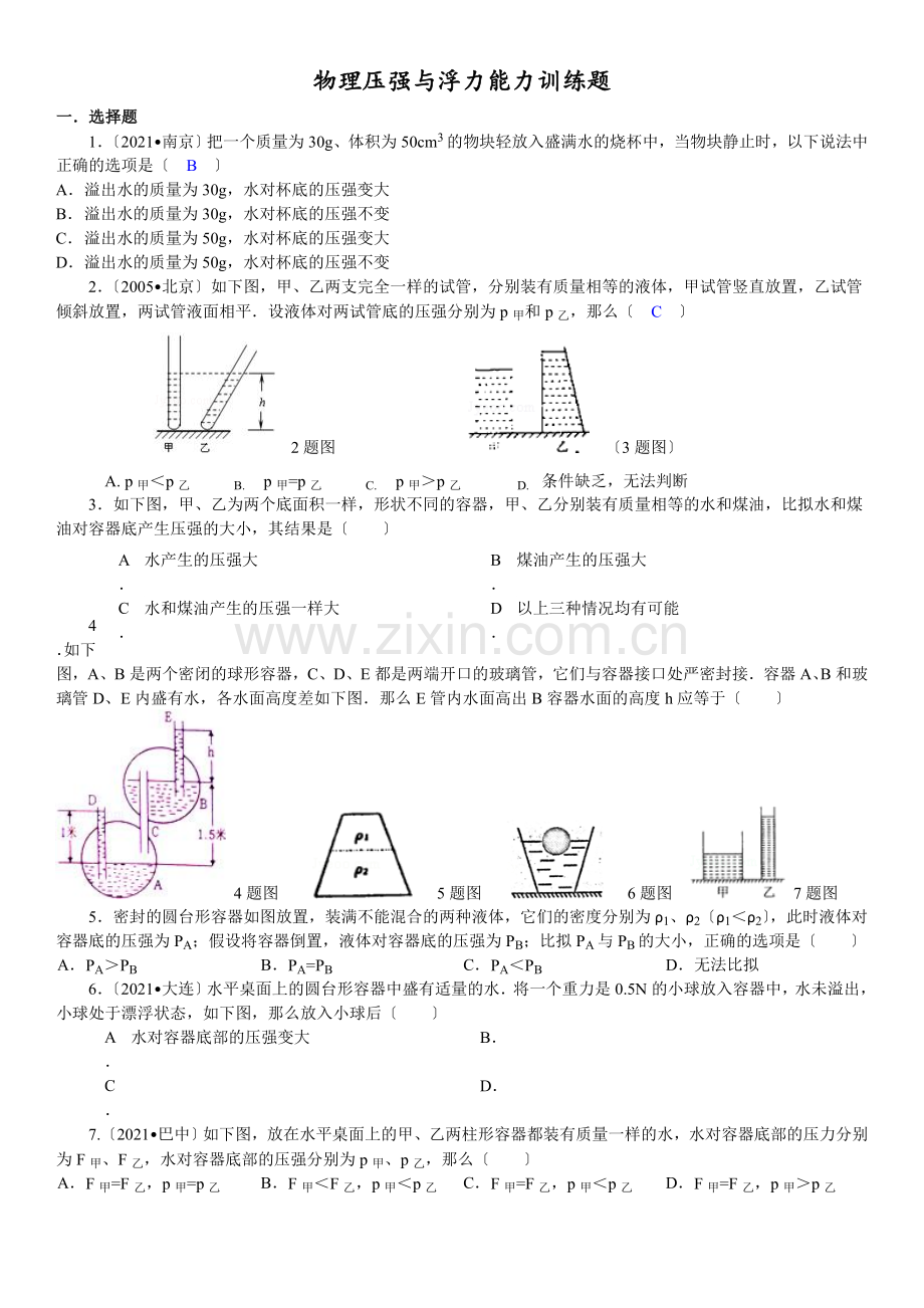 2.〔2005•北京〕如下图,甲、乙两支完全一样的试管,分别装有质量相等的液体,甲试管竖直放置,乙试管倾斜放置,两试管液面相平.设液体对两试管底的压强分别为p甲和p乙,那么〔 C 〕