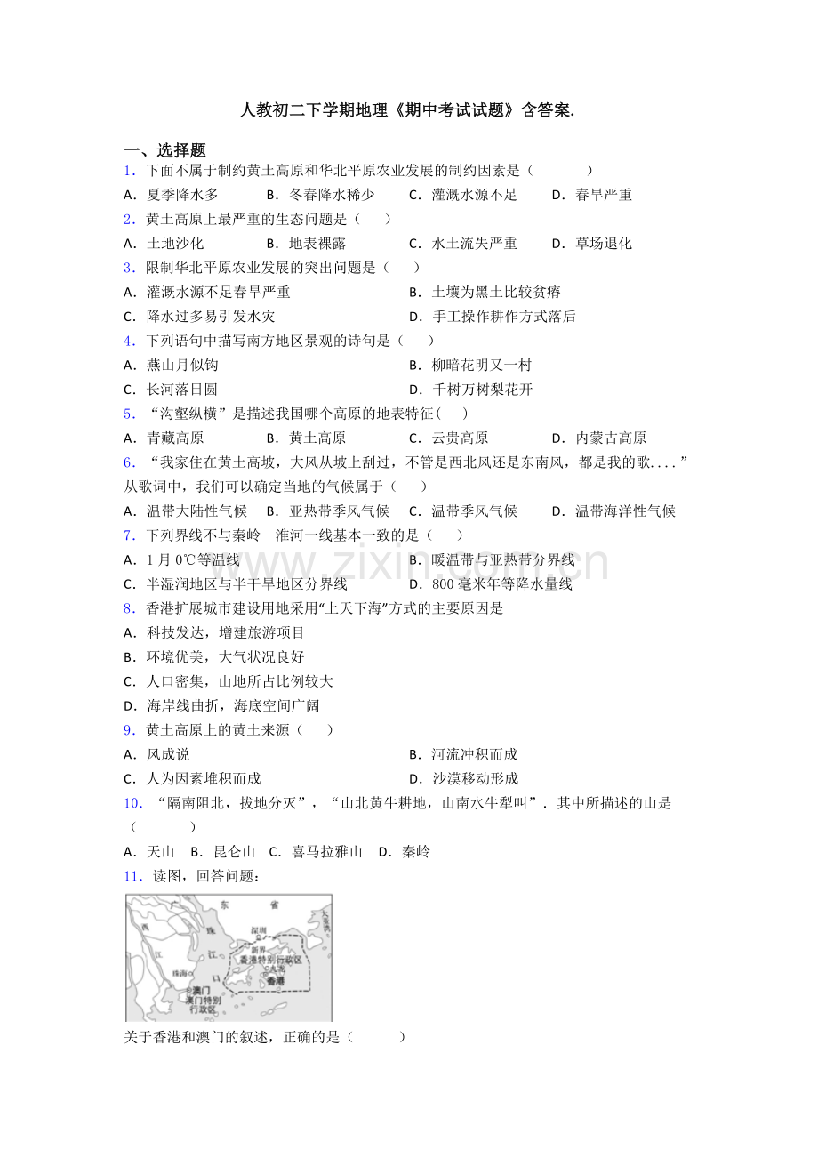 人教初二下学期地理《期中考试试题》含答案.