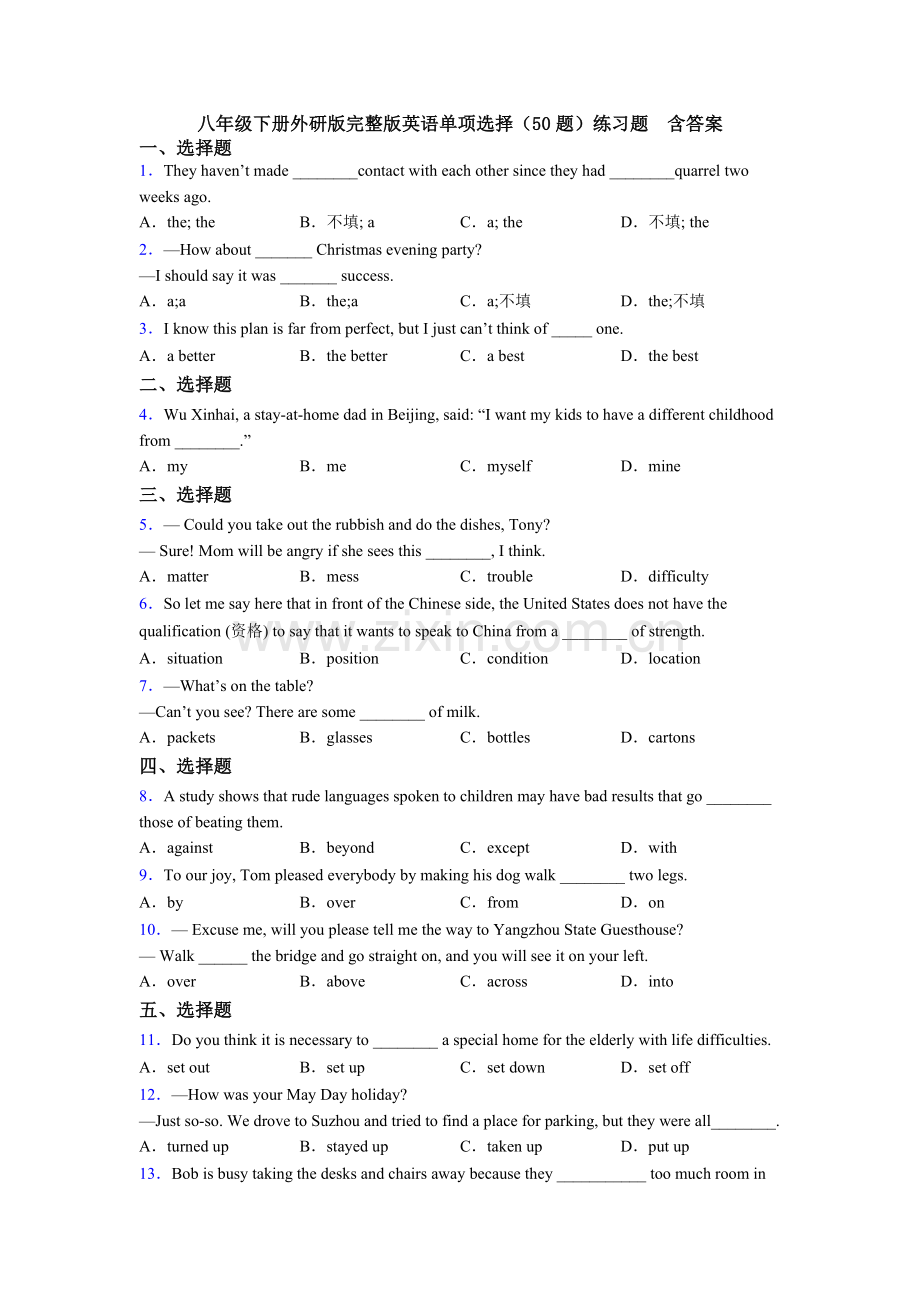 八年级下册外研版完整版英语单项选择(50题)练习题 含答案