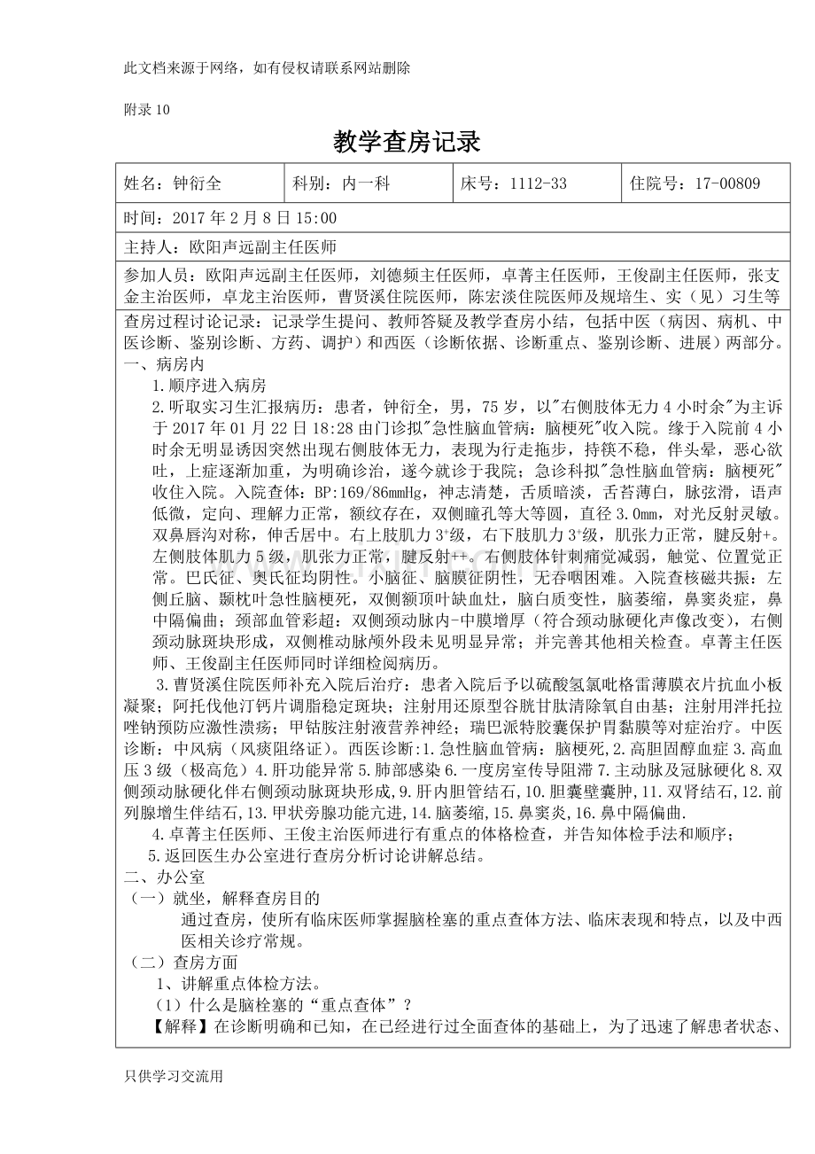查房过程讨论记录:记录学生提问、教师答疑及教学查房小结,包括中医(病因、病机、中医诊断、鉴别诊断、方药、调护)和西医(诊断依据、诊断重点、鉴别诊断、进展)两部分。