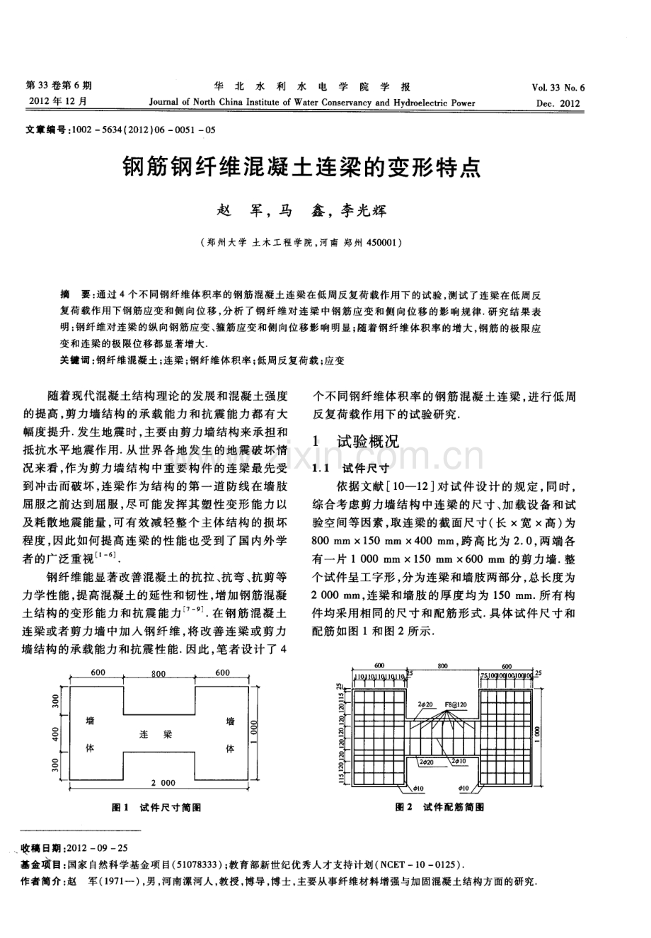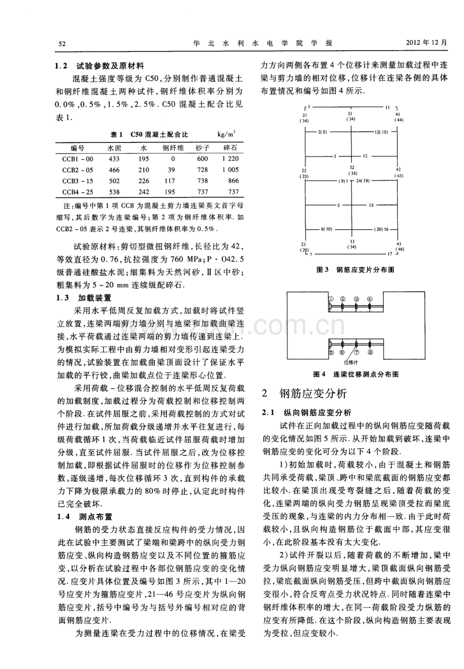 第 3 3卷第 6期 2 0 1 2年 1 2月 华北水利水电学院学报 J o u rn a l o f N o a h C h i n a I n s t i t u t e o f Wa t e r C o n s e r v a n c y a n d Hy d r o e l e c t r i c P o w e r Vo 1 3 3 No 6 De c 2 01 2 文章 编号 : 1 0 0 2 5 6 3 4 ( 2 0 1 2 ) 0 6 0 0 5 1 0 5 钢筋钢 纤维混凝土连梁 的变形特点 赵 军,马 鑫,李光辉 ( 郑州大学 土木工程 学院, 河南 郑州 4 5 0 0 0 1 ) 摘 要 : 通 过 4个不 同钢纤维体积率 的钢筋混凝土 连梁在低周反 复荷载作用下 的试 验 , 测试 了连梁在低周反 复荷载作用下钢筋应变 和侧 向位移 , 分析 了钢 纤维 对连 梁 中钢筋应 变 和侧 向位移 的影 响规律 研 究结 果表 明 : 钢纤维对连 梁的纵向钢筋应变 、 箍筋应变和侧 向位移影 响 明显 ; 随着钢 纤维体积 率的增大 , 钢筋 的极 限应 变和连梁的极限位移都显著增 大 关键 词 : 钢纤维混凝 土 ; 连梁 ; 钢纤维体积率 ; 低周反复荷载 ; 应 变 随着现代混凝土结构理论的发展和混凝土强度 的提高, 剪力墙结构的承载能力 和抗震能力都有大 幅度提升 发生地震时 , 主要 由剪力墙结构来承担和 抵抗水平地震作用 从世界各地发生 的地震破坏情 况来看 , 作为剪力墙结构 中重要构件的连梁最先受 到冲击而破坏 , 连梁作为结构 的第一道防线在墙肢 屈服之前达到屈服 , 尽可能发挥其塑性 变形能力 以 及耗散地震能量 , 可有效减轻整个主体 结构 的损坏 程度 , 因此如何提高连梁的性能也受 到了国内外学 者的广泛重视 钢纤维能显著改善混凝土的抗拉、 抗弯 、 抗剪等 力学性能 , 提高混凝土的延性和韧性 , 增加钢筋混凝 土 结 构 的变形 能 力 和 抗 震 能 力 在 钢 筋 混 凝 土 连梁或者剪力墙中加入钢纤维 , 将改善连梁或剪力 墙结构的承载能力和抗震性能 因此 , 笔者设计了 4 6 0 0 60 0 图 1 试 件尺寸简图 个不同钢纤维体积率 的钢筋混凝土连梁 , 进行低周 反复荷载作用下 的试验研究 1 试验概况 1 1试 件尺 寸 依据文献 1 0 1 2 对试件设 计 的规定 , 同时 , 综合考虑剪力墙结构 中连梁 的尺寸、 加载设备 和试 验空间等 因素 , 取连梁的截面尺寸( 长 宽 高) 为 8 0 0 m m1 5 0 mm4 0 0 mm, 跨高 比为 2 0 , 两端各 有一片 1 0 0 0 m m1 5 0 m m6 0 0 mm的剪力墙 整 个试件呈工字形 , 分为连梁和墙肢两部分 , 总长度为 2 0 0 0 m m, 连梁和墙肢的厚度均为 1 5 0 mm 所有构 件均采用相 同的尺寸和配筋形式 具体试件尺寸和 配筋如图 1和图 2所示 J l O J 1 0 ,1 l O d l O Ll 1 5 J 0 a 叫 删 0 d I 1 1 1 J 一F 8 1 2 o , 1 善 I l I 1 I I I 一 | I 图 2试件配筋简图 收稿 日期 : 2 0 1 2 0 9 2 5 基金 目 : 国家 自然科学 基金项 目( 5 1 0 7 8 3 3 3 ) ; 教育部新世 纪优秀人才支持计划 ( N C E T一1 0 0 1 2 5 ) 作者简 介 : 赵军 ( 1 9 7 1 一 ) , 男 , 河南漯河人 , 教授 , 博导 , 博士 , 主要从 事纤 维材料增强与加 固混凝土结构方面 的研究 f _ , _ _ 5 2 华 北 水利 水 电 学 院 学 报 2 0 1 2年 1 2月 1 2 试验 参数 及原 材料 混凝土强度等级为 C 5 0 , 分别制作普通混凝土 和钢纤维混 凝土两 种试 件 , 钢 纤维 体积 率分别 为 0 0 , 0 5 , 1 5 , 2 5 C 5 0混 凝 土配合 比见 表 1 表 1 C 5 0混凝土配合比 k g m 注 : 编号中第 1项 C C B为混凝 土剪 力墙 连梁英 文首 字母 缩写 , 其后 数 字 为 连 梁 编 号 ; 第 2项 为 钢 纤 维 体 积 率 如 C C B 2 0 5表示 2号连梁 , 其钢纤维体积率为 0 5 试 验原 材料 : 剪切 型微 扭 钢 纤维 , 长径 比为 4 2 , 等效直径为 0 7 6 , 抗拉强度为 7 6 0 MP a ; P0 4 2 5 级普通硅酸盐水泥 ; 细集料为天然河砂 , 区中砂 ; 粗集料 为 5 2 0 m m连 续级 配碎 石 1 3加载 装置 采用 水 平 低周 反 复 加 载方 式 , 加 载 时将 试 件 竖 立放置 , 连梁两端剪力墙分别与地梁和加 载曲梁连 接 , 水平荷载通过连梁两端的剪力墙传递到连梁上 为模拟实际工程中由剪力墙相对变形引起连梁受力 的情况 , 试验装置在加载曲梁顶面设计了保证水平 加载的平行铰, 曲梁加载点位于连梁形心位置 采 用荷 载 一位移 混合 控制 的水平 低周 反 复荷载 的加载制度 , 加载过程分为荷 载控制和位移控制两 个阶段 在试件屈服之前 , 采用荷载控制的方式对试 件进行加载 , 所加荷载分级递增并水平往复进行 , 每 级 荷载 循环 1 次 , 当荷 载 临 近 试件 屈 服 荷 载 时 增加 分级 , 直至试件屈服 当试件屈服之后 , 改为位移控 制加载, 即根据试件屈服时的位移作为位移控制参 数 , 逐级递增 , 每次位移循环 3次 , 直到构件 的承载 力下降为极限承载力 的 8 0 时停止 , 认定此 时构件 已完 全破 坏 1 4测 点布置 钢筋 的受力状态直接反应构件的受力情况 , 因 此在试验 中主要测试了梁端和梁跨 中的纵向受力钢 筋应变 、 纵向构造钢筋应变 以及不 同位置的箍筋应 变 , 以分析在试验过程 中各部位钢筋应变的变化情 况 应变片具体位置及编号如 图 3所示 , 其中 1 2 0 号应变片为箍筋应变片 , 2 1 4 6号应变片为纵向钢 筋应变片 , 括号中编号为与括号外编号相对应的背 面钢筋应变片 为测量连梁在受力过程 中的位移情况 , 在梁受 力方 向两侧各布置 4个位移计来测量加载过程中连 梁与剪力墙的相对位移 , 位移计在连梁各侧 的具体 布置情况和编号如图4所示 图 3 钢筋应变 片分布 图 图 4连 梁 位 移 测 点分 布 图 2 钢筋应变分析 2 1 纵 向钢筋 应变 分析 试件在正向加载过程 中的纵向钢筋应变随荷载 的变化情况如图 5所示 从开始加载到破坏 , 连